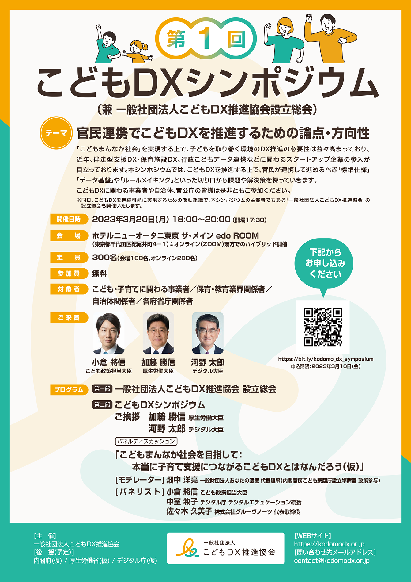 一般社団法人こどもDX推進協会(所在地:東京都港区、代表理事:小池義則)は、こどもDXが健全に普及する仕組みづくりを行い、テクノロジーを活用して持続可能な「こどもまんなか社会」を実現することを目的に設立されました。これを記念し「一般社団法人こどもDX推進協会の設立総会」および「こどもDXシンポジウム」を3月20日月曜日に開催することをお知らせいたします。本シンポジウムでは、こどもDXを推進する上で、官民が連携して進めるべき「標準仕様」「データ基盤」や「ルールメイキング」といった切り口から課題や解決策を探ってまいります。