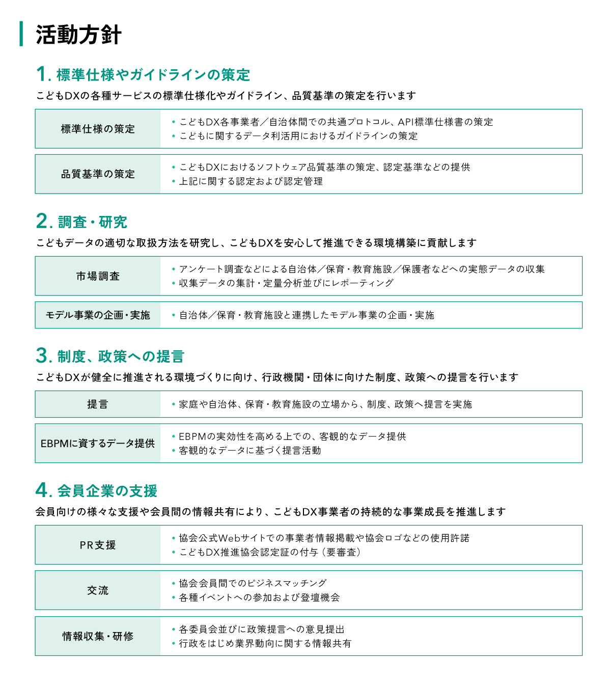 主にこどもDXに関わる各種システムの標準化、こどもと保護者・省庁・自治体・保育施設・ICT事業者などをつなぐプラットフォームの議論、各種調査・研究、こどもDXに関する政策提言などを行う事を目的に、2023年4月に発足するこども家庭庁をはじめ厚生労働省、デジタル庁など各省庁と連携して、テクノロジー活用の側面から「こどもまんなか社会」の実現を実効性を持って推進します。
