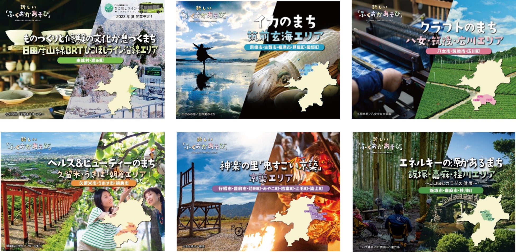 6 つのエリアは、ものづくりと修験の文化が息づくまち「日田彦山線 BRT ひこぼしライン沿線エリア」、イカのまち「筑前玄海エリア」、クラフトのまち「八女・筑後・広川エリア」、ヘルス&ビューティのまち「久留米・うきは・朝倉エリア」、神楽の里“鬼すごい京築”「京築エリア」、エネルギーの源があるまち「飯塚・嘉麻・桂川エリア」、です。そのエリアで楽しめる体験やグルメ情報、おすすめのモデルコースなど各エリアに来訪したくなるような情報を積極的に紹介しました。