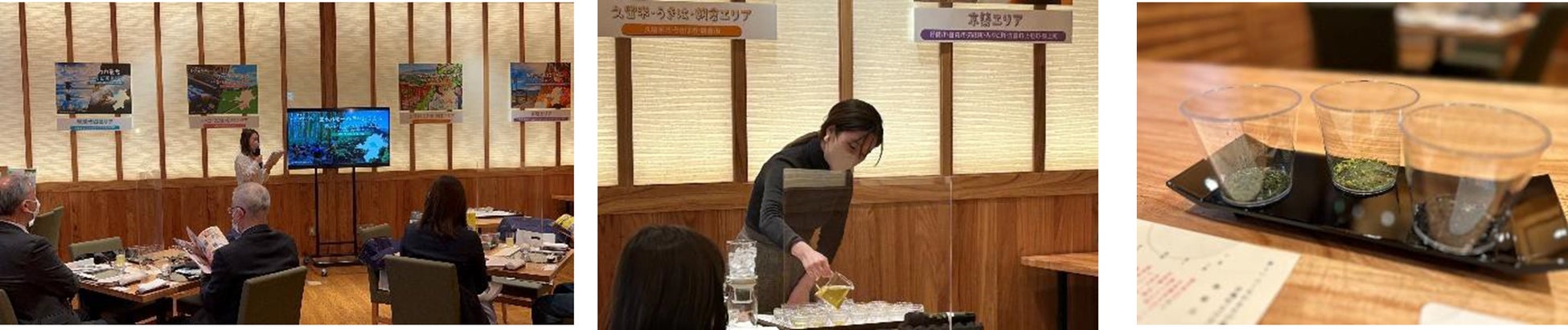 イベントでは、新しい「ふくおかあそび」として6つの新しい観光エリアの紹介後、県産の海山の幸をふんだんに使用した旬のコース料理を堪能いただくとともに、福岡県八女市矢部村の茶農園「茶寮 千代乃園」の八女茶の試飲体験、レストラン内の装飾にも使用され、福岡県大川市の伝統的な組子技術を 60 年 3 代に渡り継承する「仁田原建具製作所」による大川組子の製作体験を実施いたしました。