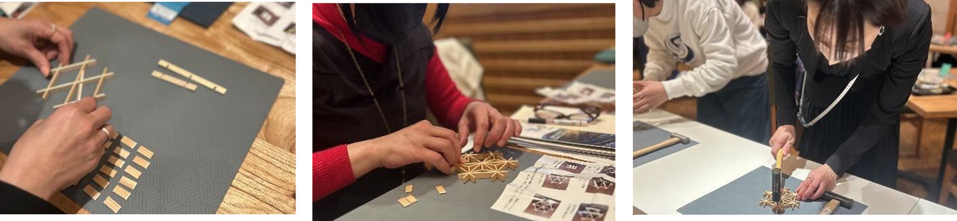 大川組子の製作体験では美しく仕上がる組子に「初めてだが楽しい」、「またやってみたい」との声があがりました。