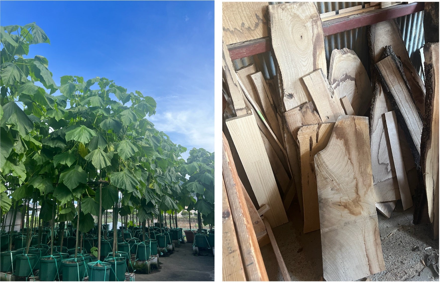 旧月夜野町、現在のみなかみ町のアトリエで苗木から桐を育てているほか、廃棄木材を使用したコレクションも積極的に販売しています