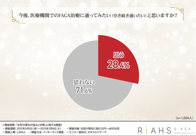 「今後、医療機関でのFAGA治療に通ってみたい(引き続き通いたい)と思いますか?」と質問したところ、3割近くの方が『思う(28.4%)』と回答しました。
