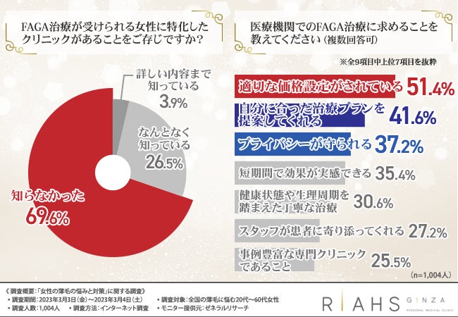 さらに、FAGA治療が受けられる女性に特化したクリニックの認知度はまだまだ低く、適切な価格であることや自分に合ったプランで治療をしてくれるということを求めていることが分かりました。
