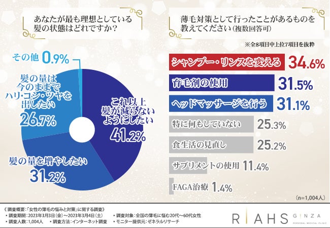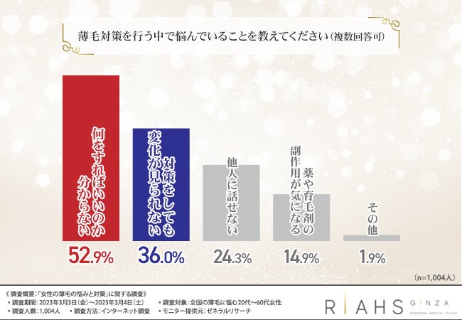 そこで、発毛専門の医療機関『リアスクリニック』(https://riahsclinic.com/)は、全国の薄毛に悩む20代~60代女性を対象に、「女性の薄毛の悩みと対策」に関する調査を行いました。