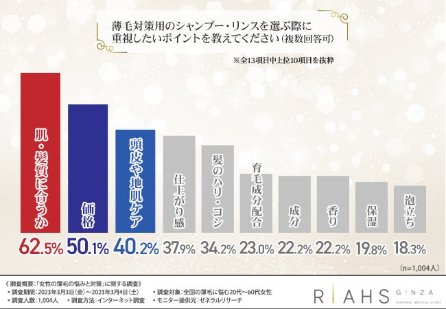 続いて、「薄毛対策用のシャンプー・リンスを選ぶ際に重視したいポイントを教えてください(複数回答可)」と質問したところ、『肌・髪質に合うか(62.5%)』と回答した方が最も多く、次いで『価格(50.1%)』『頭皮や地肌ケア(40.2%)』と続きました。