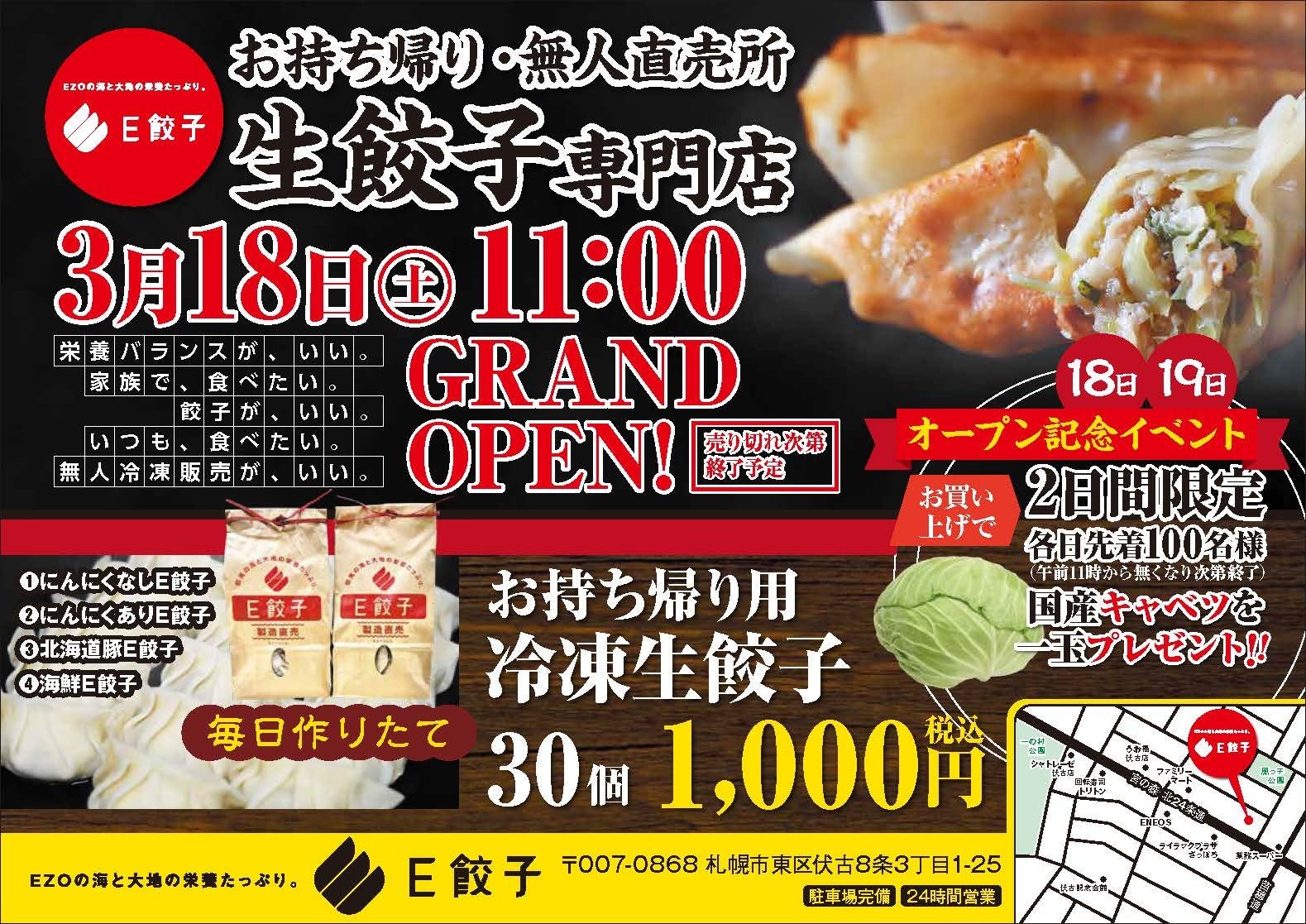 生餃子専門店【E餃子】新規オープン‼ 札幌市東区伏古に北海道の美味い食材をたっぷり使用した生餃子専門店がオープン致します。