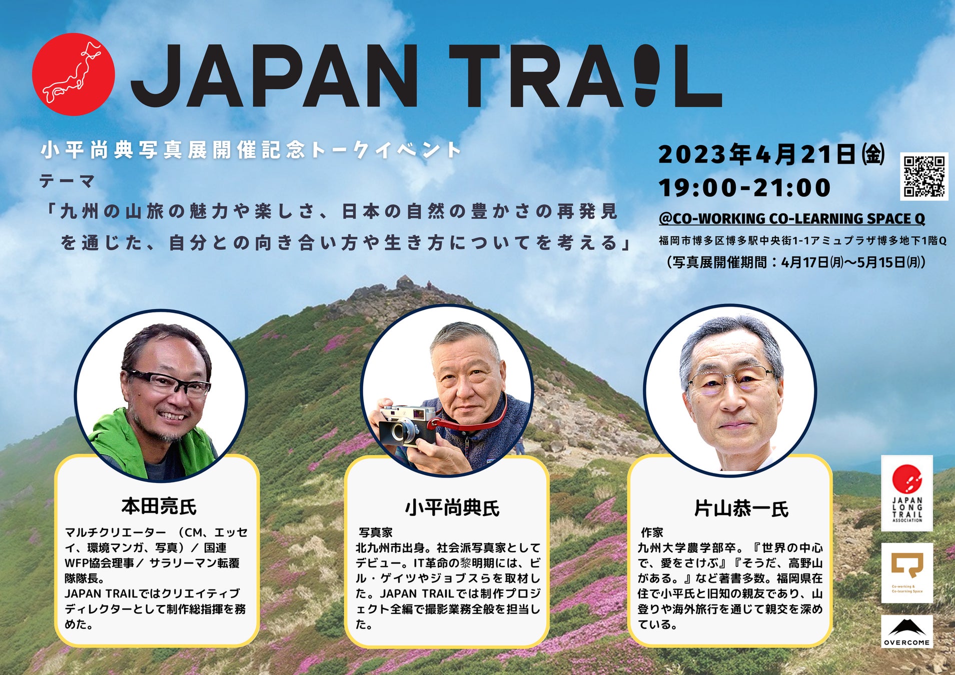 写真家小平尚典氏、JAPAN TRAIL®提唱委員会(NPO法人日本ロングトレイル協会内)および株式会社オーバーカムが、2023年4月21日(金)に博多コワーキングスペースQにて「JAPAN TRAIL」トークイベントを開催します。
