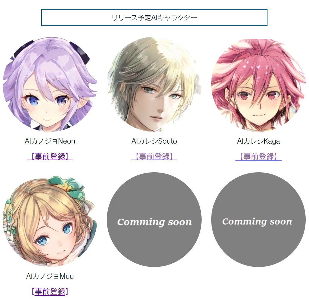 今回、リリースするアイキャラは「AIカノジョNeon」と「AIカノジョMuu」と「AIカレシSouto」と「AIカレシKaga」になり、プロンプト(呪文)を常時設定する機能を実装しております。