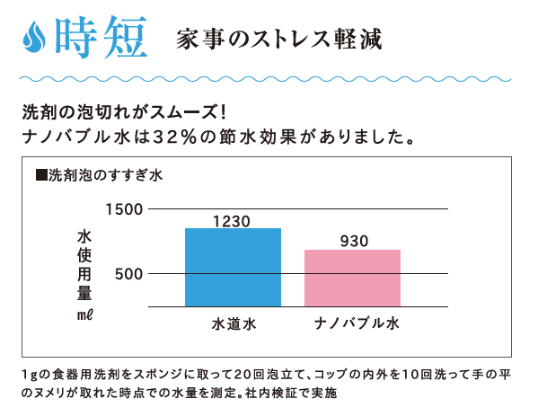 実験では普通の水道水に比べ、洗剤のすすぎ水が32%節水できたことが分かりました。