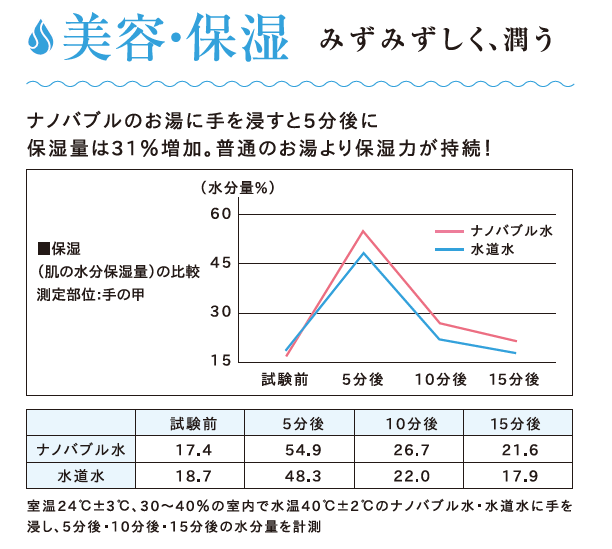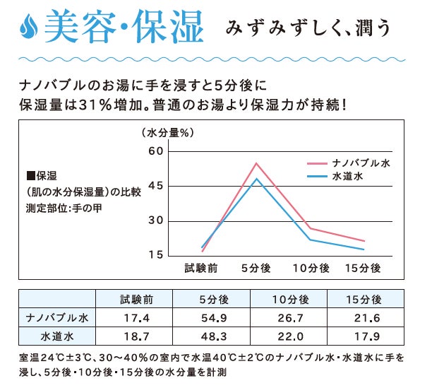 実験では、普通の水道水のお湯に比べ、手の甲の保湿量は31%増加したことが分かりました。