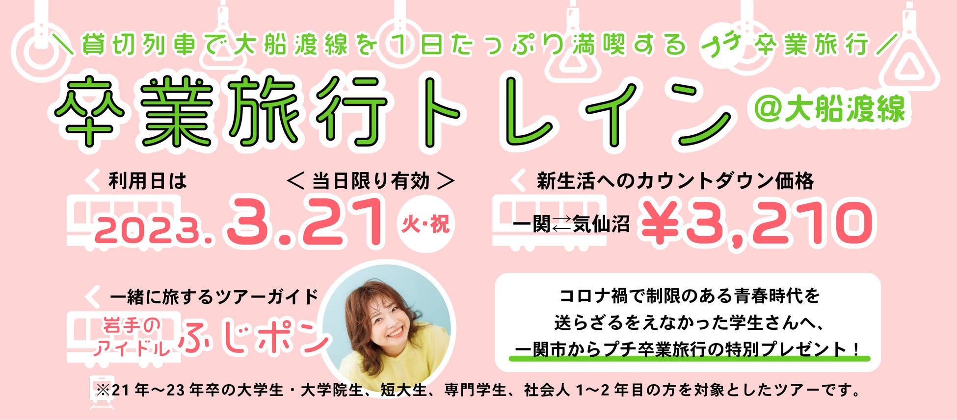 一般社団法人いわて圏(岩手県一関市、代表理事:佐藤柊平)は、一関市のJR大船渡線観光活用推進事業の一環として「卒業旅行トレイン@大船渡線」を運行します。