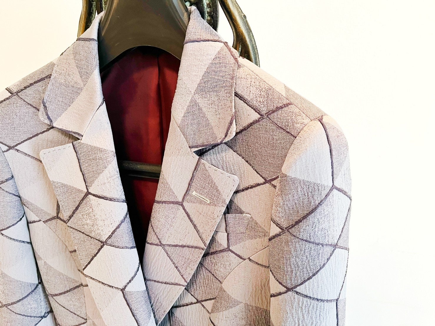 「Luciorta」が提供するジャケットは、特注で織られた高級カーテンのオフカット生地をアップサイクルして作られています。当社がオーダーメイドスーツ事業で培った技術を生かし、高級カーテン生地ならではの柄や質感の特長を引き出しながら、一着ずつ丁寧に仕立てています。登録をしてくださった本サービスのご利用者様は、そのラインアップの中から必要なタイミングで希望のジャケットを選び、貸し出しを受けることができます。