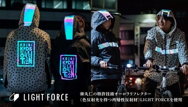 (株)丸仁の特許技術オーロラリフレクター(色反射光を持つ再帰性反射材)LIGHT FORCE(ライトフォース)を使用。
