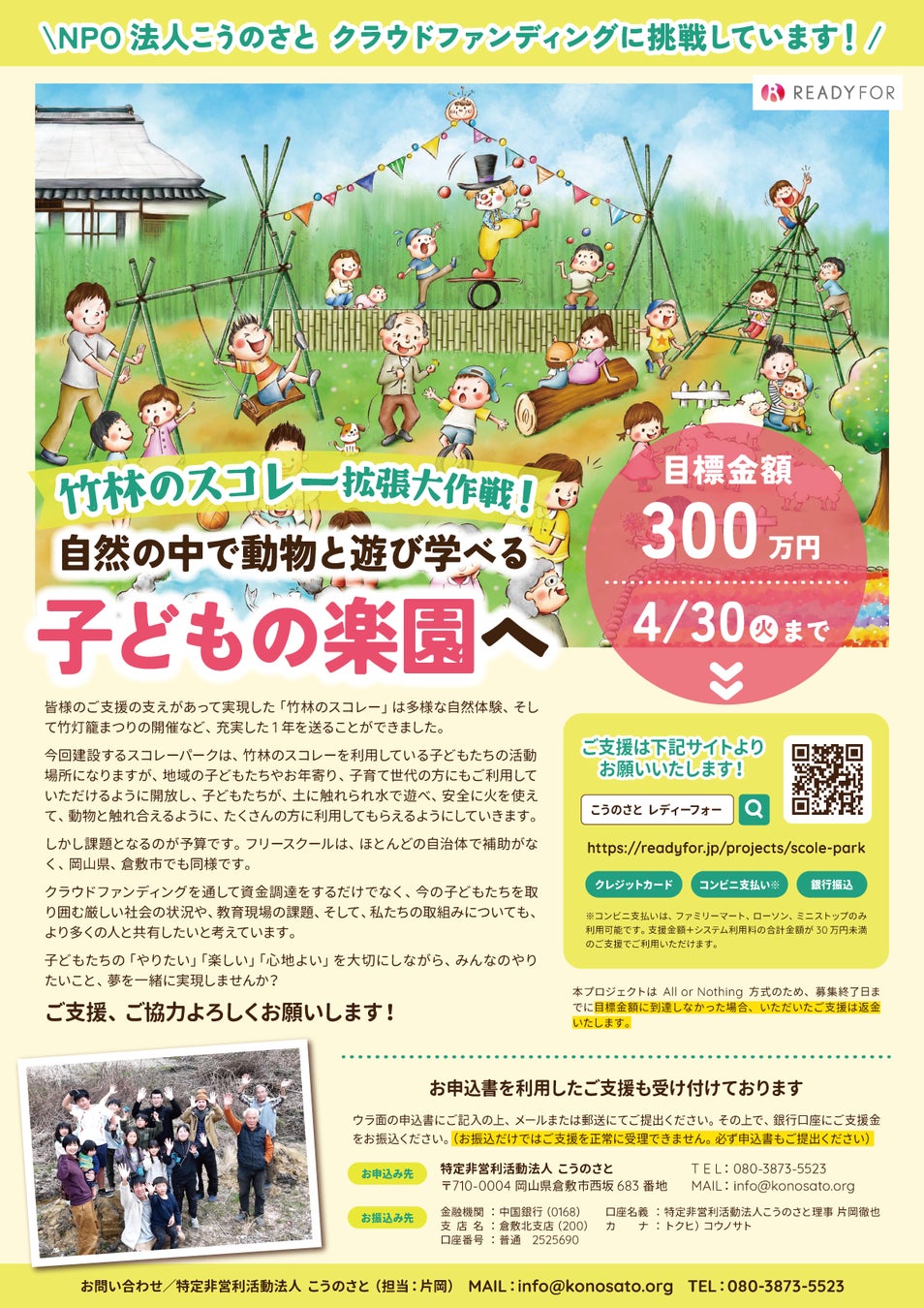 文科省発表の令和4年度 児童生徒の問題行動・不登校調査※1によると小中学生の不登校児が全国で約29万9千人、岡山県内で3,668名となり、過去最大を更新している。NPO法人こうのさとでは、不登校児や新しい形の学びを求める子どもたちが日中過ごす場として、令和5年4月に「竹林のスコレー」を開校。現在、15名の児童が利用している。来年度には、都心部から自然豊かな環境を求めて、ご家族で移住してご利用される方もいる。