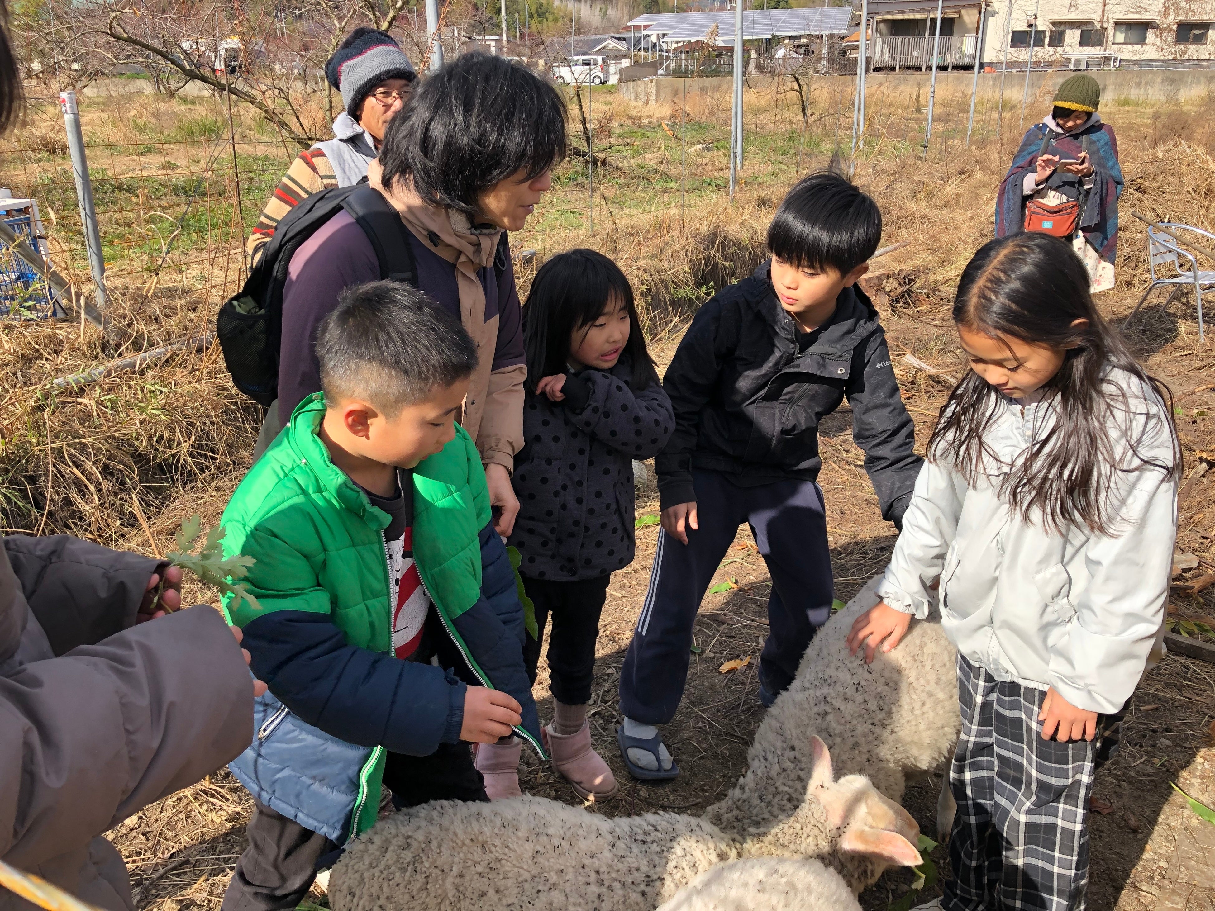 その活動の中、子どもたちの多様な自然体験をサポートするため、近隣の耕作放棄地を開墾しヤギや羊などの動物を飼育でき、土や水に触れられて自然の中で遊び学べる公園の建設を目指す。下の写真は、スコレーにボランティアで来てくれている方の羊を見学に行ったときの様子。