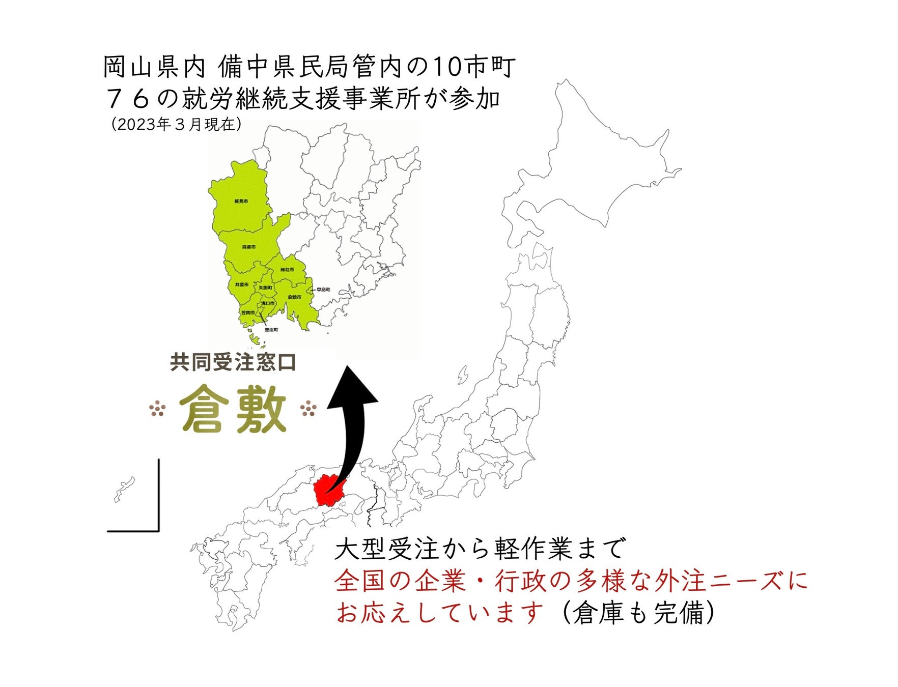 ※共同受注窓口倉敷には、岡山県備中県民局管内で76の障がい者就労継続支援事業所(2023年3月現在)が参加登録しています。