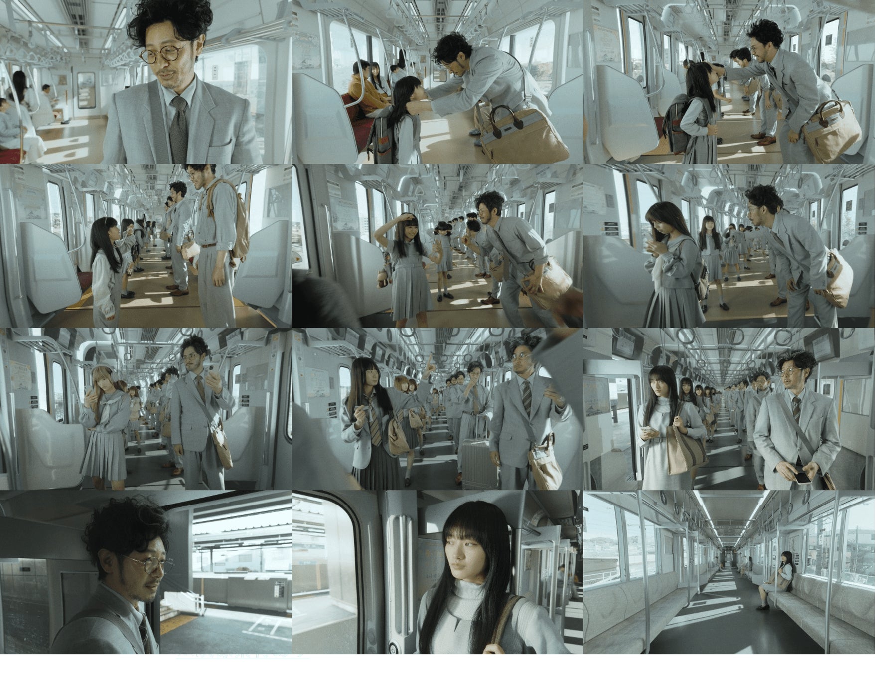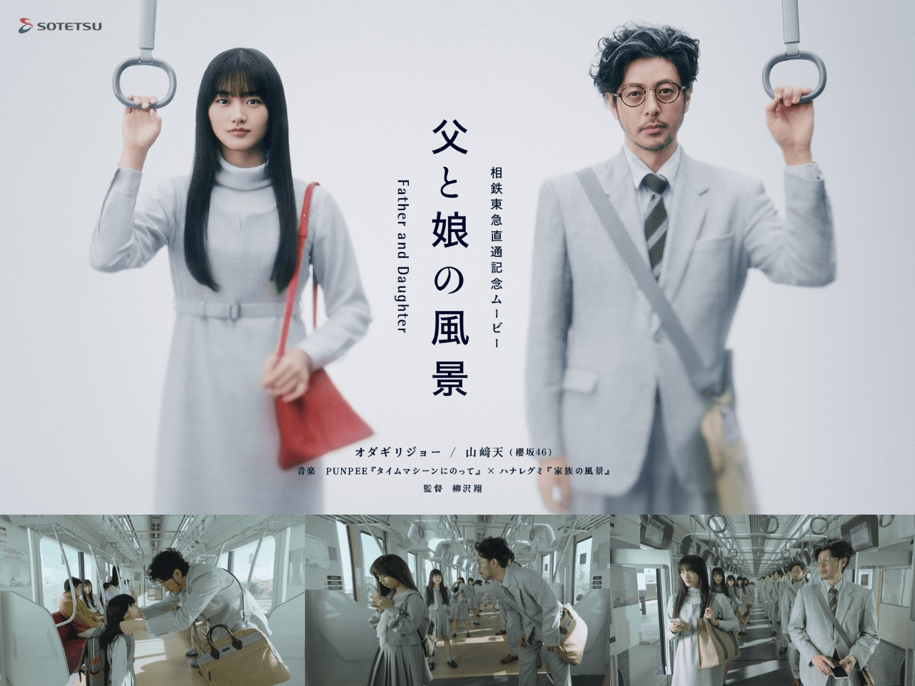 映像では、相鉄線の車内を舞台に、幼少期・思春期・反抗期など小学生から高校卒業までさまざまに変化していく親子の関係を、オダギリさんと山﨑さんをはじめ、6歳から46歳まで総勢50人の父娘キャストが演じています。ラストシーンで、相鉄線の駅で降りる父と、相鉄・東急直通線に乗って東京へと向かう娘。春から東京へ通学する娘に「東京、遠いな」と声をかける父に対し、「あっというまだよ」と娘が答えるシーンでは、かつて「遠い」と言っていた幼少期からの成長を感じられぐっと引き込まれます。娘を見守る優しいオダギリさんの表情や、新たな春へ踏みだす山﨑さんの表情にぜひご注目ください。
