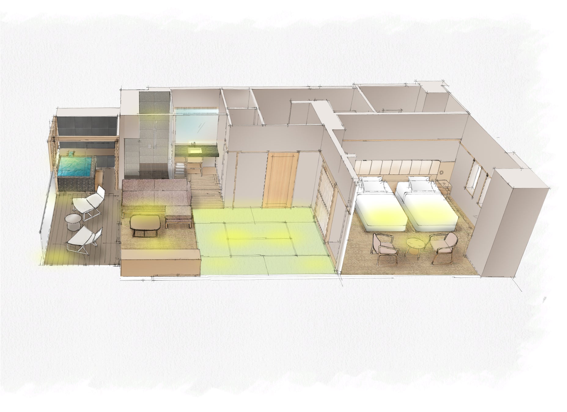 前ホテル時代102室あった客室は1部屋あたりの広さを拡張し全50室に改装。窓一面に美しい湖景が拡がる本館には50平米(テラス含む)のスタンダードルームをはじめとして、自家源泉の温泉を引き込む露天風呂を備える最大125平米超の露天風呂付客室タイプが16室、本館に隣接するグランピングエリアには、広々としたデッキテラスやリビングルーム、ベッドルーム、自家源泉の温泉露天風呂などを備えたヴィラ12室を完備。浴室に施された信楽焼の腰壁は歴史を感じさせる逸品。宵闇に炎揺らめく幻想的なファイヤーピットを眺め温かいお飲み物で寛いだり、お部屋のテラスから満天の星空を眺めたりと、自然を感じながら豊かなひと時をお過ごしいただけます。また、ドッグフレンドリーヴィラ宿泊の愛犬ものびのびと遊んでいただけるようドッグランも設けました。