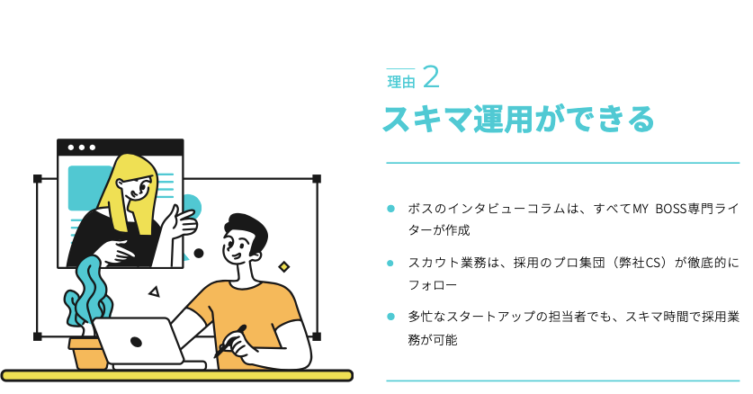 スタートアップで働きたい人はたくさんいるのに、知名度や採用費用やノウハウが足りないだけで出会うべき人材と出会えないのはおかしい。スタートアップ企業でも、大手に負けない採用を実現する社会を作りたいと考え『MY BOSS』の開発をスタートしました。