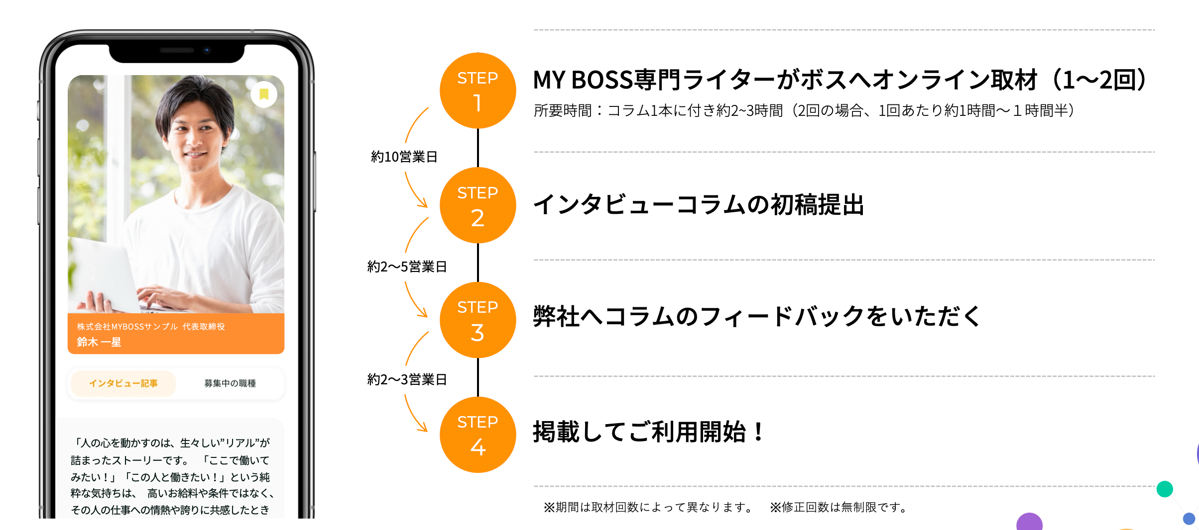 ・社長、もしくは事業責任者がボスとして取材を受けていただき、インタビューコラム掲載し、MY BOSSをご活用いただける企業様