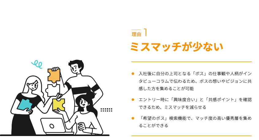 ・入社後に自分の上司となる「ボス」の仕事観や人柄がインタビューコラムで伝わるため、ボスの想いやビジョンに共感した方を集めることが可能
