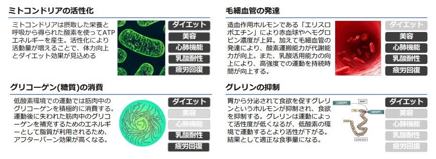 筋肉中の糖質が積極的に使われることで糖の代謝が高まるため、血糖値が高い方への効果も期待されており、運動後は脂肪を多く使うようになり脂肪燃焼効果がある。また、食欲を増進させるホルモンであるグレリンが大きく減り、その後の食事量が実際に減ることが研究で明らかにされており、平地環境では得難い運動によるダイエット効果が得られる