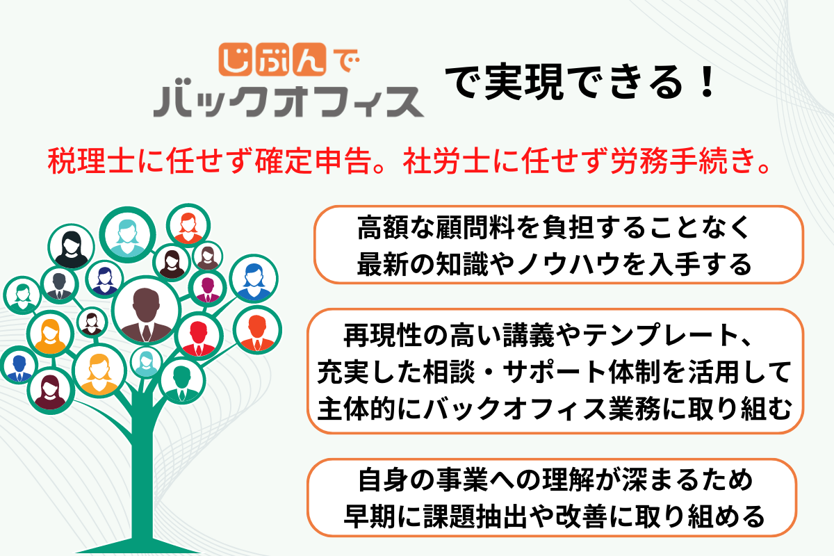 正しい知識を身に付け、自信をもってバックオフィス業務に取り組める方が一人でも多くなるようにという願いを込め、サービス名は「じぶんでバックオフィス」としました。
