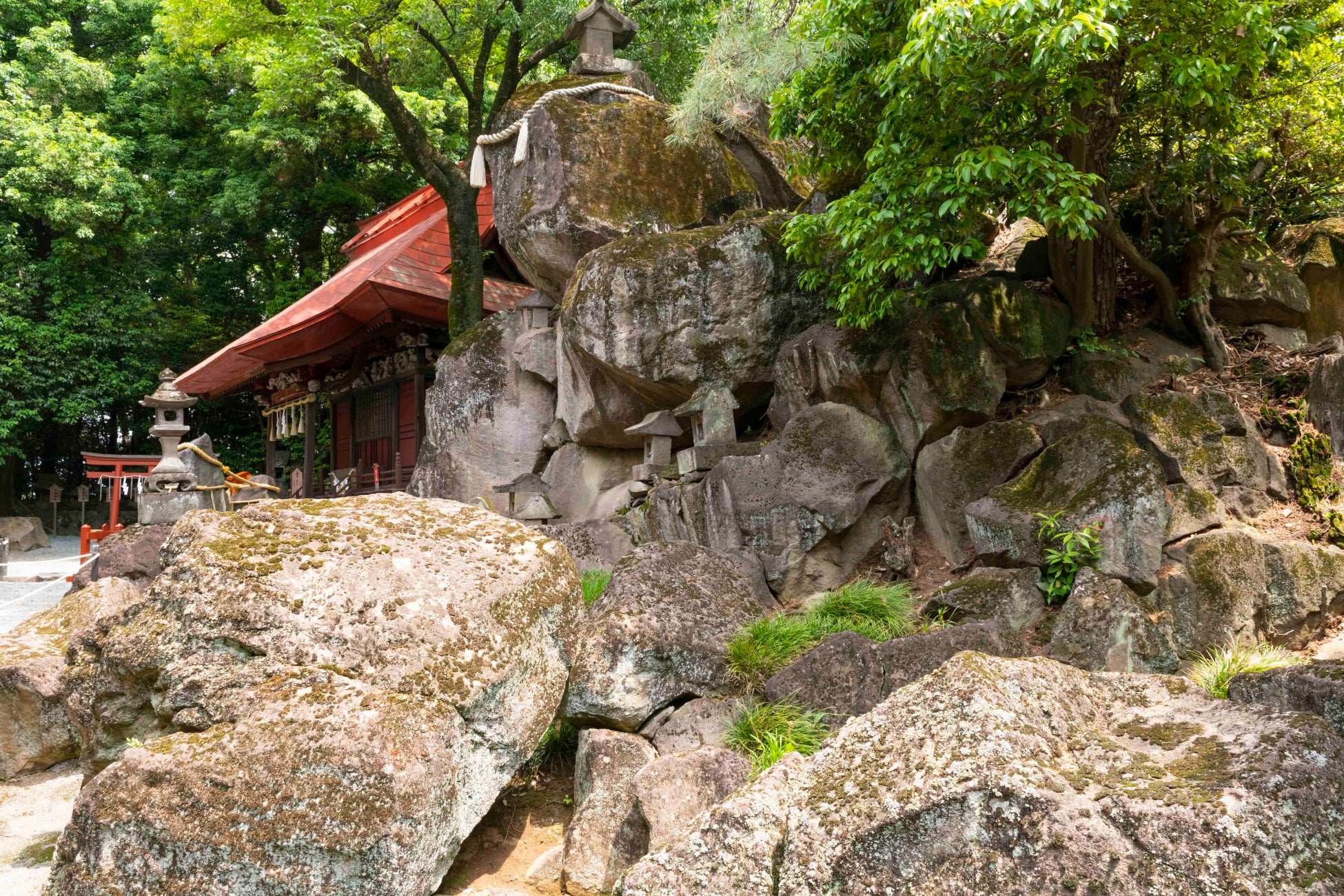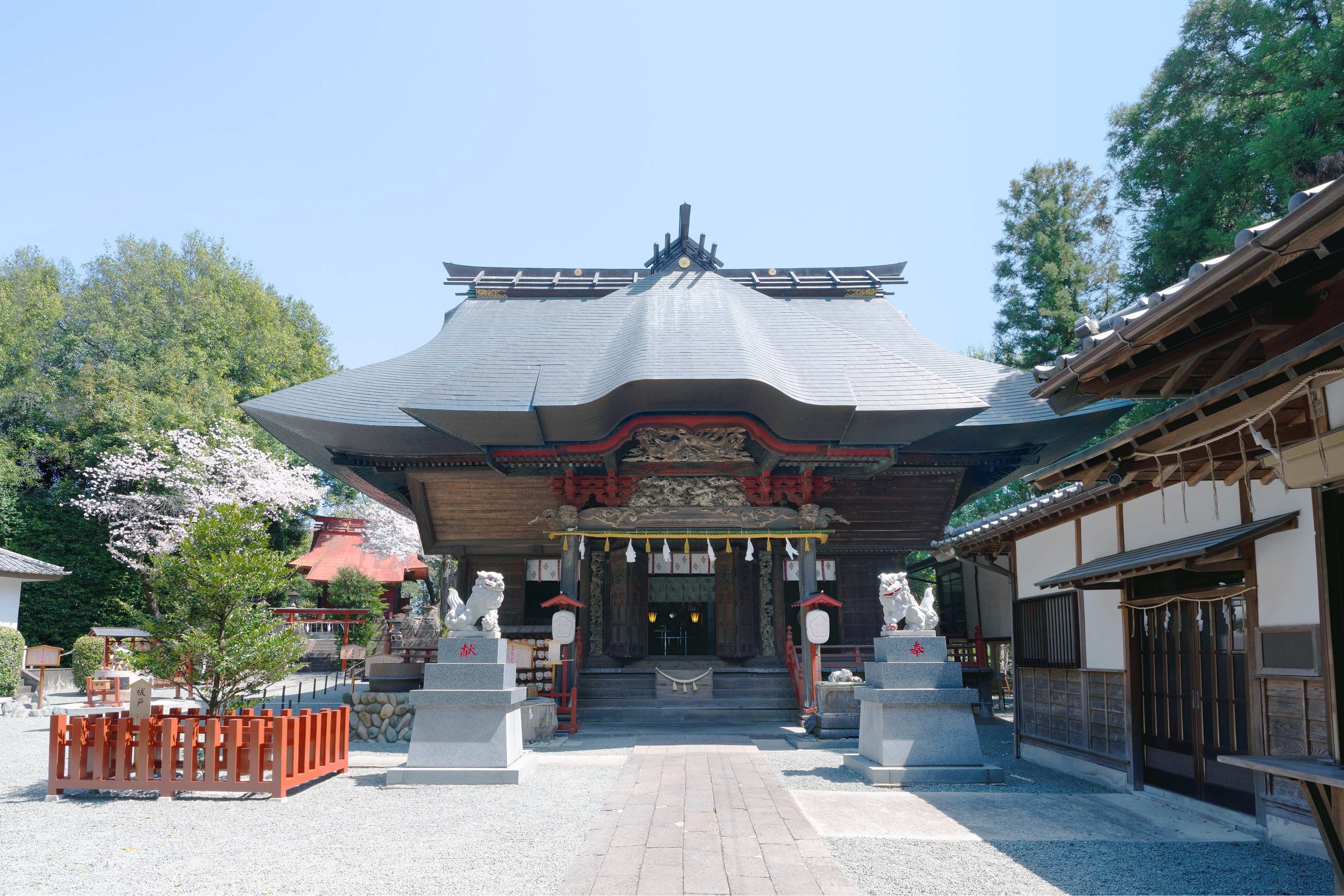 本殿、幣殿、拝殿、神門、境内地が群馬県指定重要文化財に指定されています。本殿裏には、約13万年前に赤城山で発生した「石山土石なだれ」により出現したと言われる「石山」が鎮座し、古代より神々が鎮まる磐座として信仰されています。また、境内には「安産抜けびしゃく」「安産・子育て戌」「安産胎内くぐり」の三つの安産お参りどころがあり、お参りスポットとして人気です。