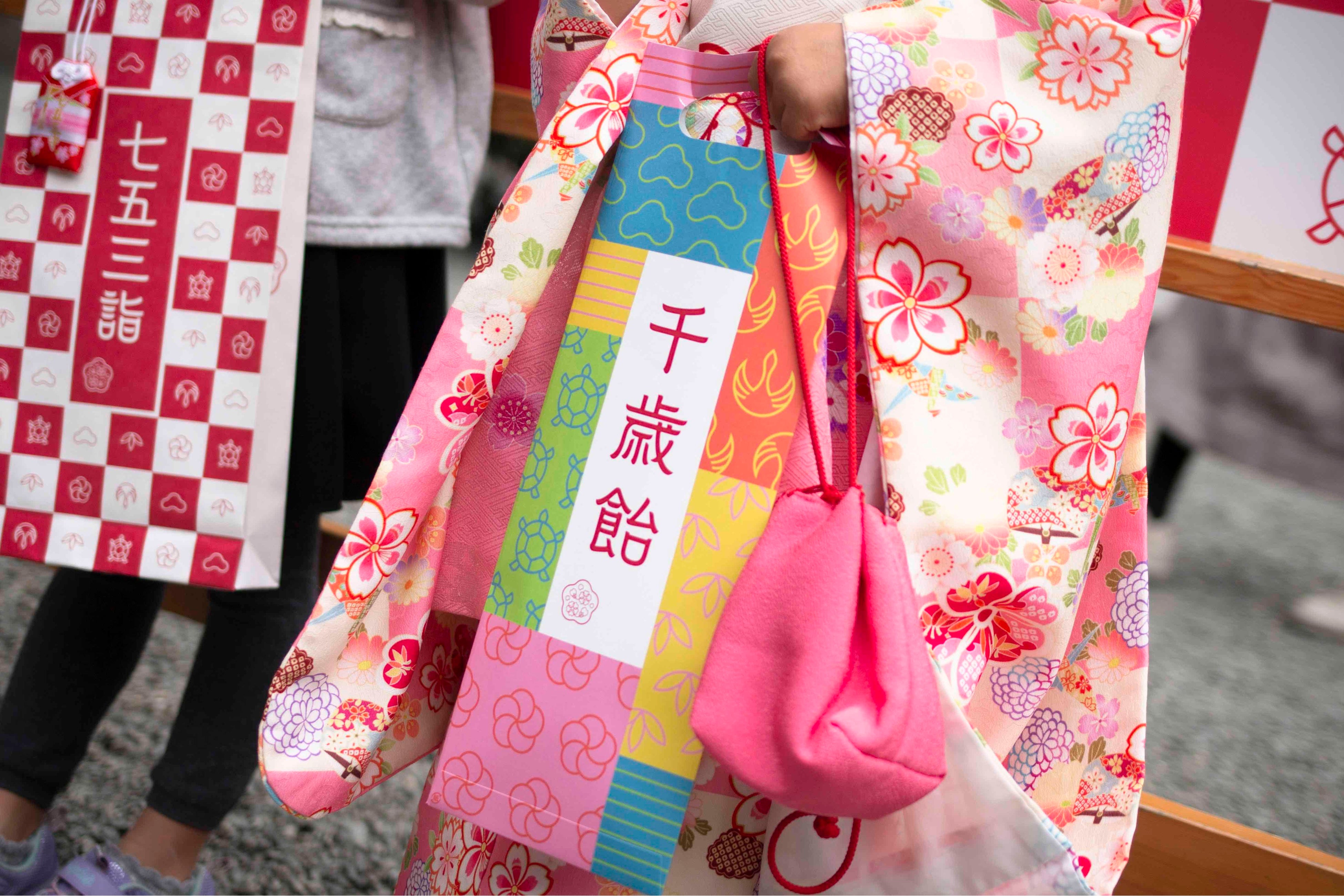 社紋が可愛らしくあしらわれた「はりこ戌」や「ベビースタイ」は産泰神社オリジナルの形状。ご祈祷の授与品としてだけでなく、赤ちゃんの成長に寄り添うものとなるでしょう。七五三の授与品には長寿と吉祥の象徴である鶴と亀があしらわれています。
