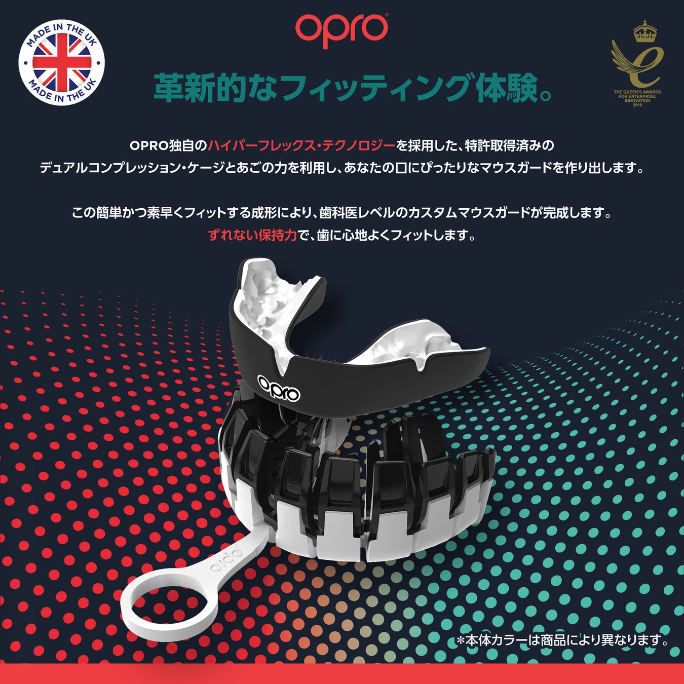 使いやすい「シングル・コンプレッション・ケージ」と、特許取得の「フィンテクノロジー」で、歯と歯ぐきの形を正確にフィッティング。超耐衝撃性を持つ「2レイヤー構造」のマウスガードです。