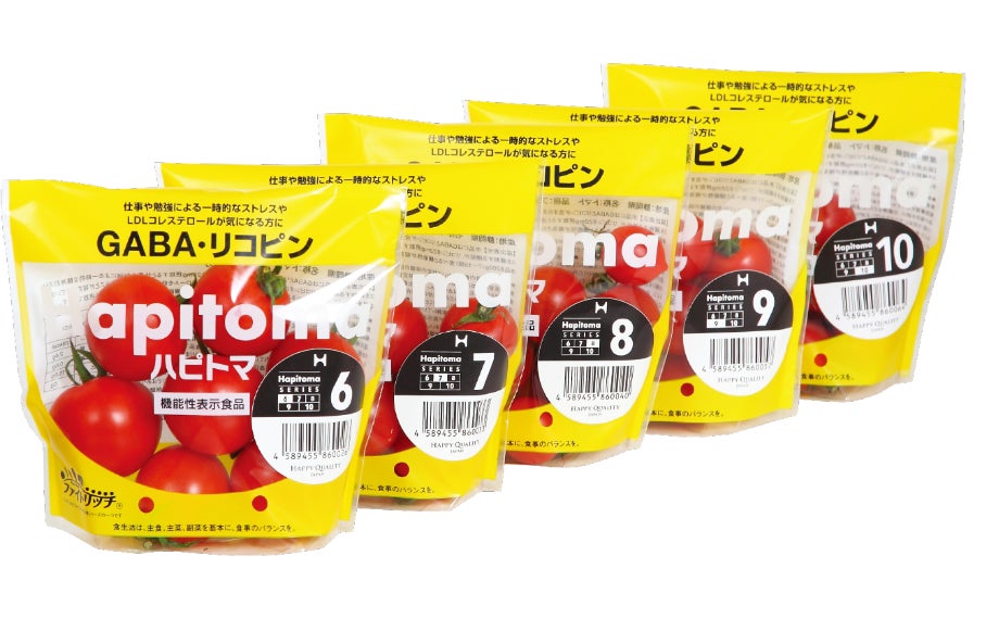 「Hapitoma®︎」は、ハッピークオリティー社が手掛ける生鮮食品では日本初の、GABA・リコピンのダブル成分の機能性表示食品です。リコピンは通常のトマトの2倍以上、生鮮トマトで初の「ストレス緩和」のヘルスクレーム(健康表示)も認められています。『Hapitoma糖度別シリーズ』は、6度から10度の商品ラインナップすることで多様化する消費者ニーズに対応した商品といえます。