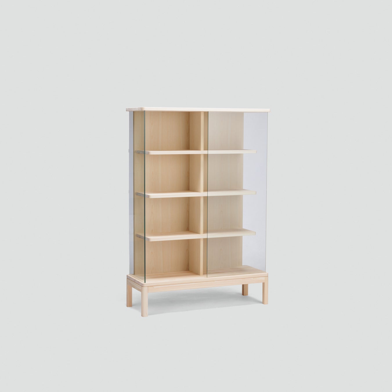 このキャビネットは、私たちの大切なものを照らすために、光を最大限に取り込むように設計・施工されています。佐賀県産のヒノキ材を使用した透明感のあるキャビネットに、大切なものを美しく飾ってほしいという願いが込められています。
