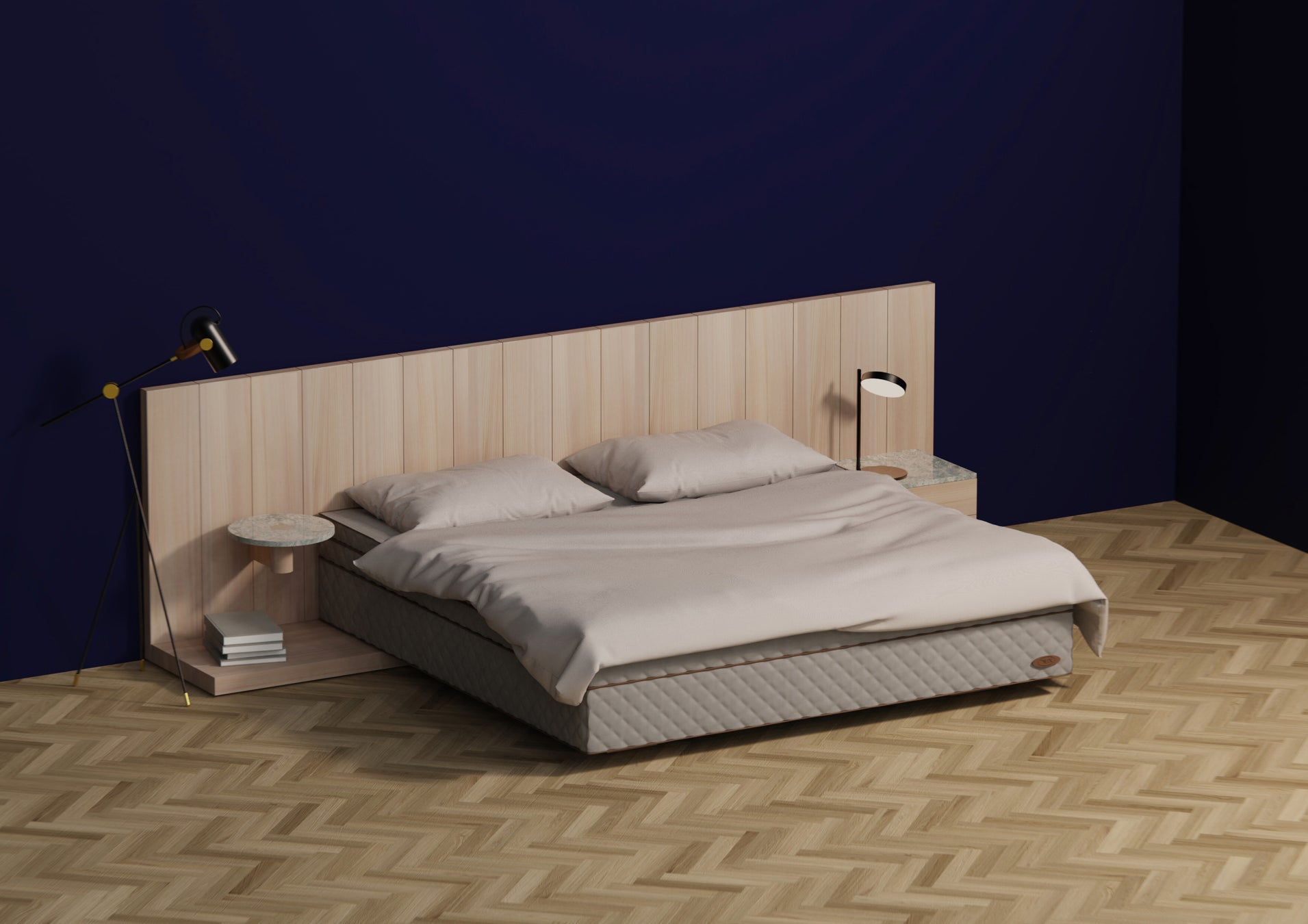 ヒノキ材は日本で崇拝されている針葉樹のひとつで、その香りと美しさで有名です。澄んだ木目と落ち着きのある香りが特徴的で、その香りは、細菌や有害な生物から守るために放出される天然のフィトンチッドによるものであり、神経系を落ち着かせるリラックス効果や、アレルギーを引き起こすダニを抑止する効果など、人間にとってさまざまな効果をもたらしてくれます。また、ヒノキ材には空気清浄効果もあり、湿気や腐敗に強いという特徴もあります。このようなヒノキ材の特性と、DUXIANAが提供する上質な睡眠体験を融合させることで、瞑想的でエレガントなヘッドボードに仕上げることをデザインのコンセプトとしています。ヘッドボードにはスウェーデンの美しい石材であるコルモルデン大理石のサイドテーブルや、ベッドの高さに合わせてスタッキングできる収納ユニットなど、お好みのナイトスペースを構成することができます。