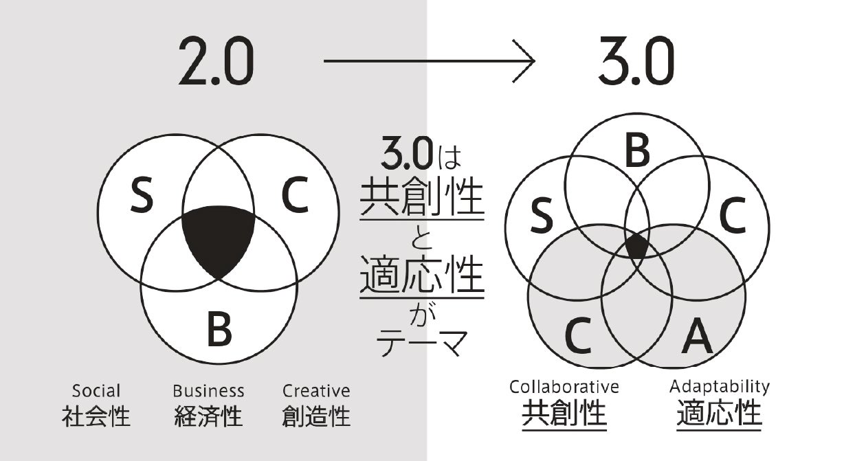 儲けることだけを中心としたビジネスモデル1.0から、前作の『ビジネスモデル2.0図鑑』では、経済性だけではなく、社会性や創造性まで備えたビジネスモデルを「ビジネスモデル2.0」と定義しました。そこからさらに、本作では、その3つに「共創性」と「適応性」を加え、「ビジネスモデル3.0」を定義しています。