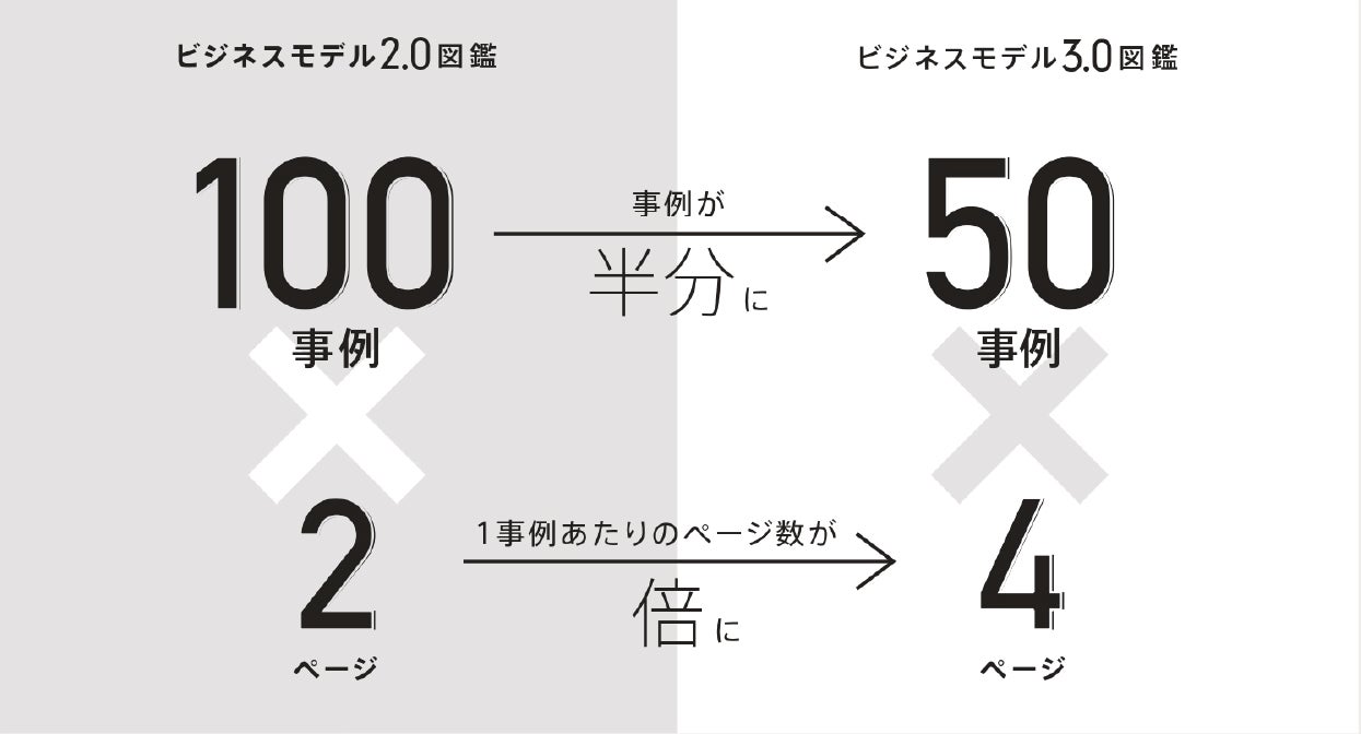 100事例を2ページずつ紹介したのがビジネスモデル2.0図鑑でしたが、本書では事例数を半分の50事例に絞り、1事例あたりのページ数が倍の4ページになっています。それにより、ビジネスモデルの変化のストーリーを追えるような深い情報を提示することができます。