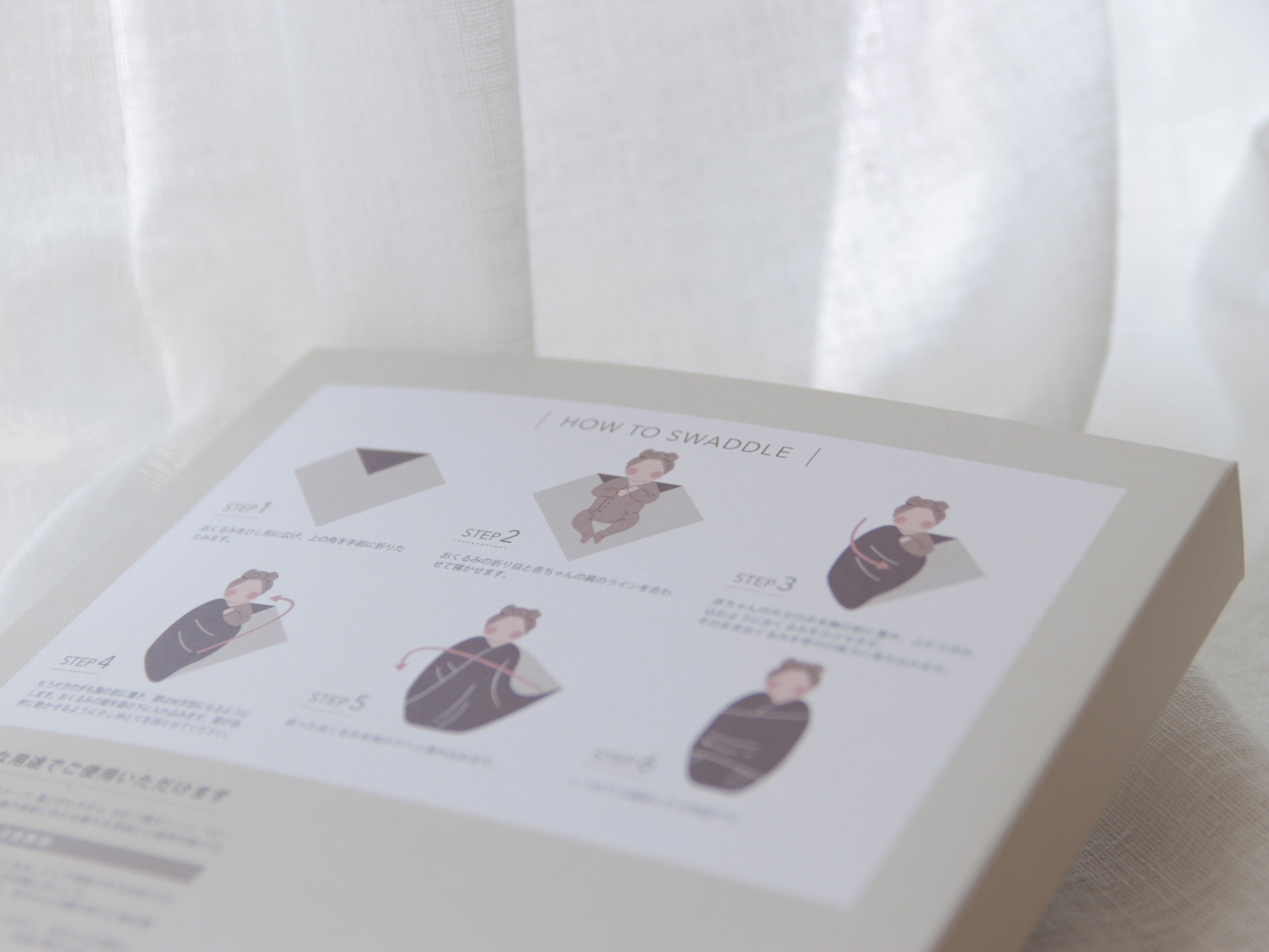 「花束スワドル」のパッケージは、そのままギフトとして贈ることができる高級感のあるゴールドの箔押しロゴの窓付きパッケージです。裏面にはスワドルの基本巻きのイラスト付きで、スワドルを初めて手にする方にも分かりやすいように配慮しています。