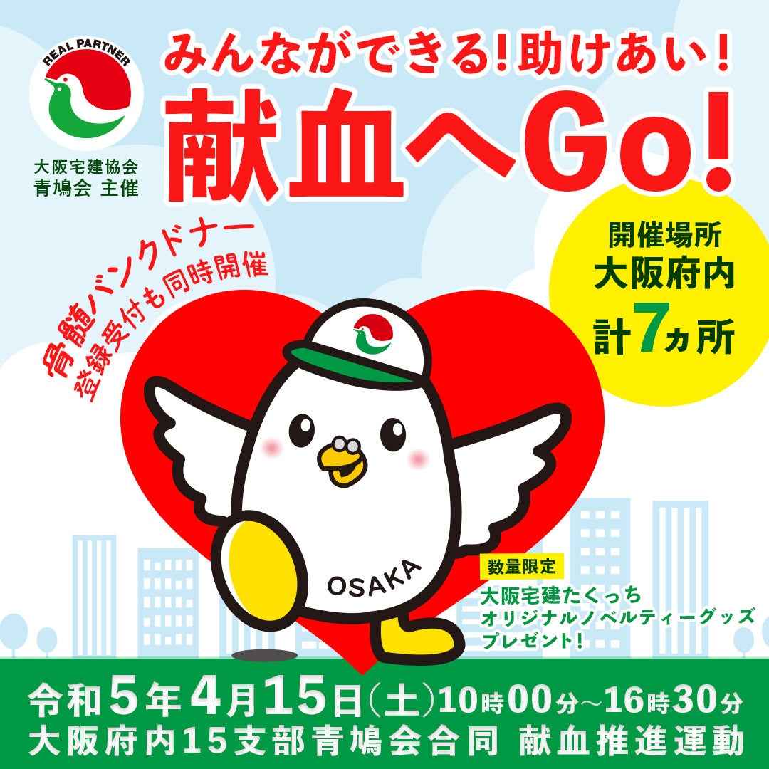 一般社団法人大阪府宅地建物取引業協会では、4/15(土)に大阪府内計7カ所の会場で献血・骨髄バンクドナー登録推進運動を実施します。