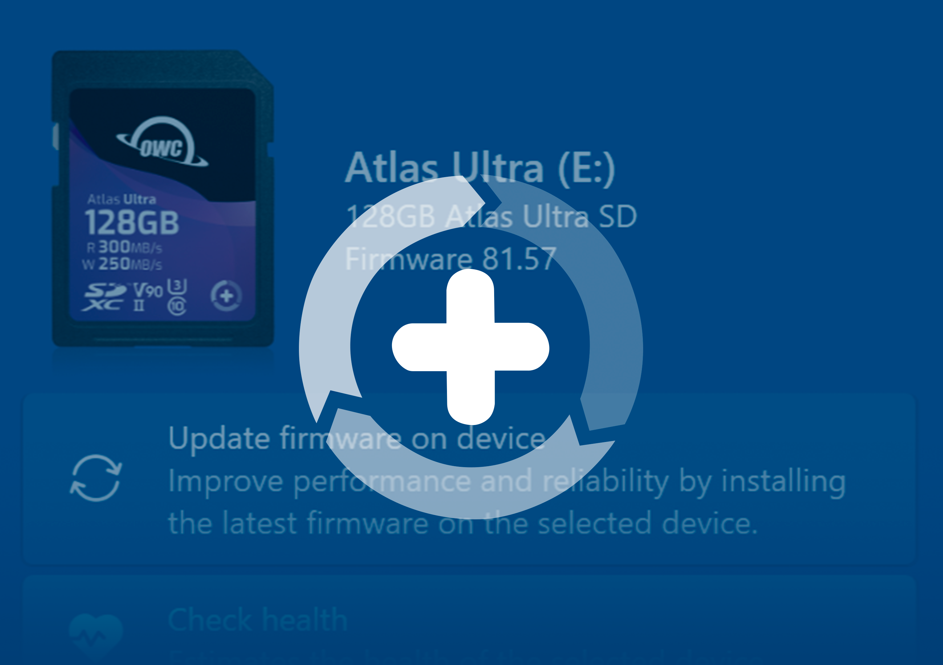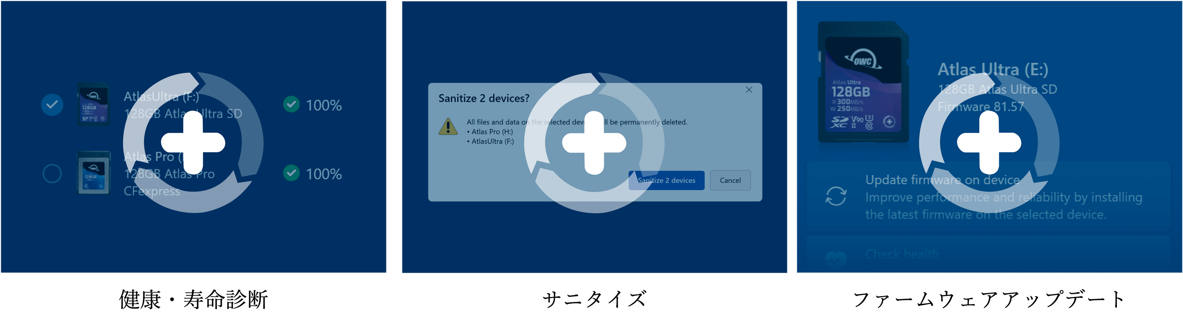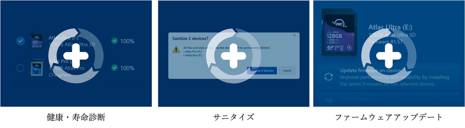 メモリーカードの寿命や健康状態を測定する「診断機能」、メモリーカードの寿命を通して箱から出した新品の状態に戻す「サニタイズ機能」、カメラなどの互換性や性能向上、問題などへの対応が可能となる「ファームウェアアップデート機能」を備え、Atlasメモリーカードをお使いのお客様が、常に最高のパフォーマンスが得られるように無償でお使いいただけるフリーソフトです。Windows、Mac OS対応。「Innergize™️」はOWC Atlasカードリーダー*2とOWC Atlasメモリーカードの組み合わせで利用できます。