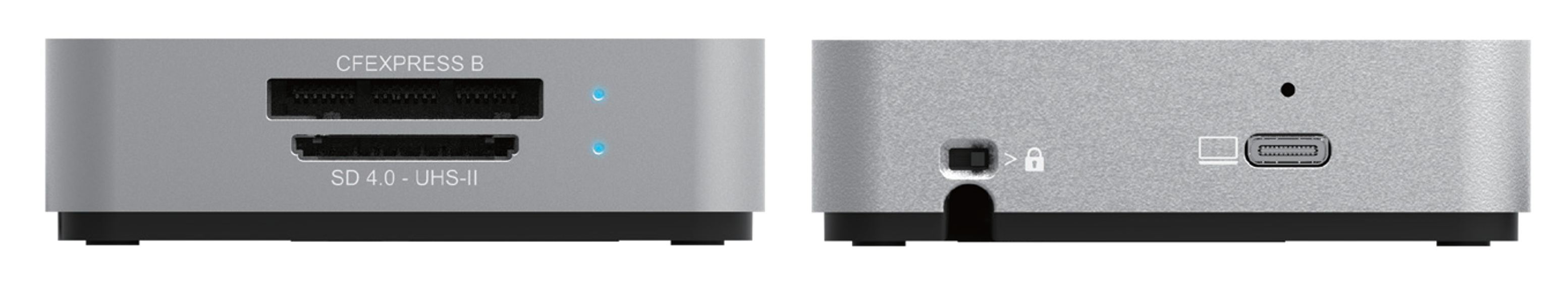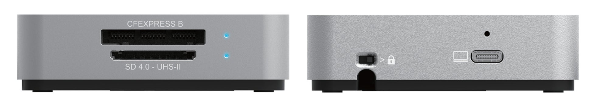 コンパクトな本体にCFexpress Type BカードとUHS-II対応SDカードの2つのスロットを備え、USB3.2 Gen2対応で、CFexpress Type B/SDを同時に、最大1032MB/s*1の高速転送が可能。本体底面に収納可能なUSB-Cケーブル、より長いケーブルでの接続に便利なUSB-Cポート、意図せぬ上書きや消去などを防ぐライトプロテクトスイッチ、カードの接続や転送が確認できるLEDインジケーターなども備え、高性能カードを使用するユーザーにも最適な設計になっています。日本での発売は7月上旬予定。想定販売価格:13,000円(税込)前後。