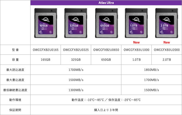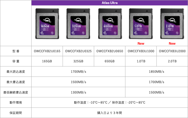 OWC CFexpress Type Bカード Atlas Ultra 1TB/2TBを発表