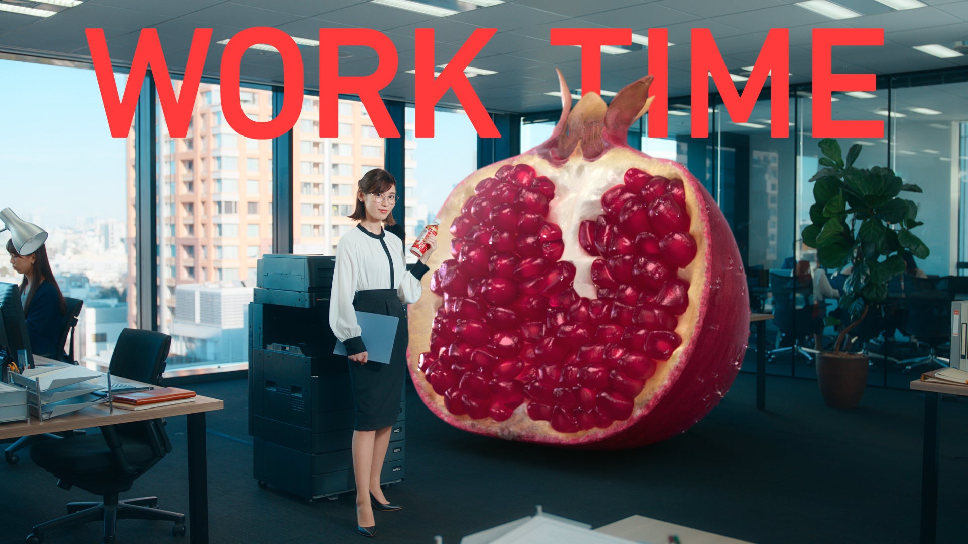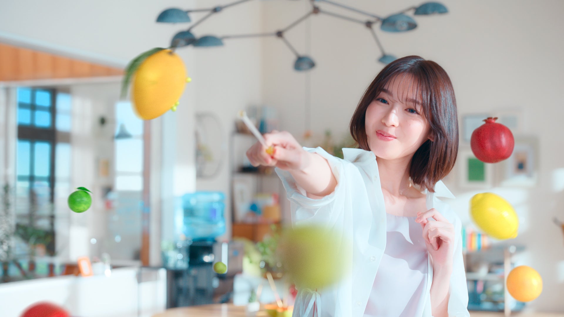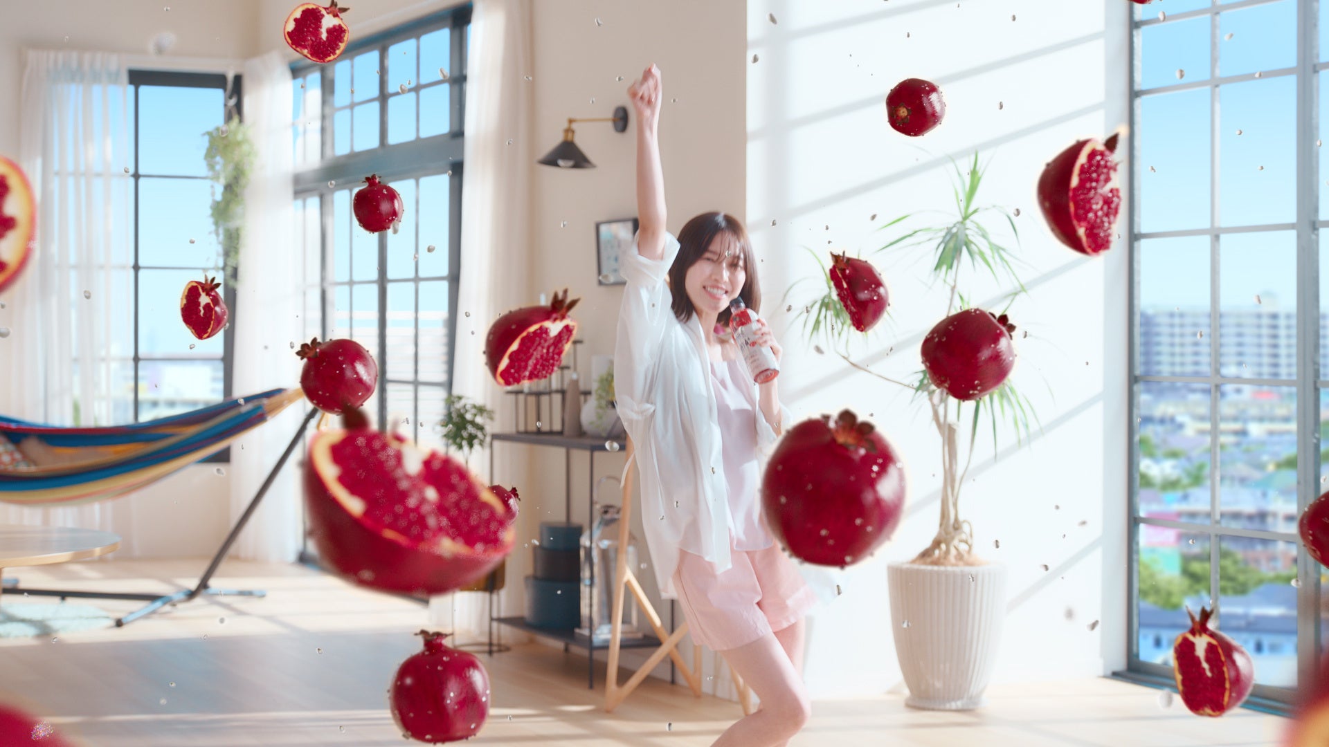 明るい日差しが差し込むリビングで、白い部屋着姿でハンモックに寝そべる白石さん。そこから立ち上がるとフレッシュなフルーツたちが白石さんを囲みます。その中からざくろを選んだ白石さんは、ざくろ味の「美酢プラス」をマイクに見立ててリズミカルなダンスを披露します。