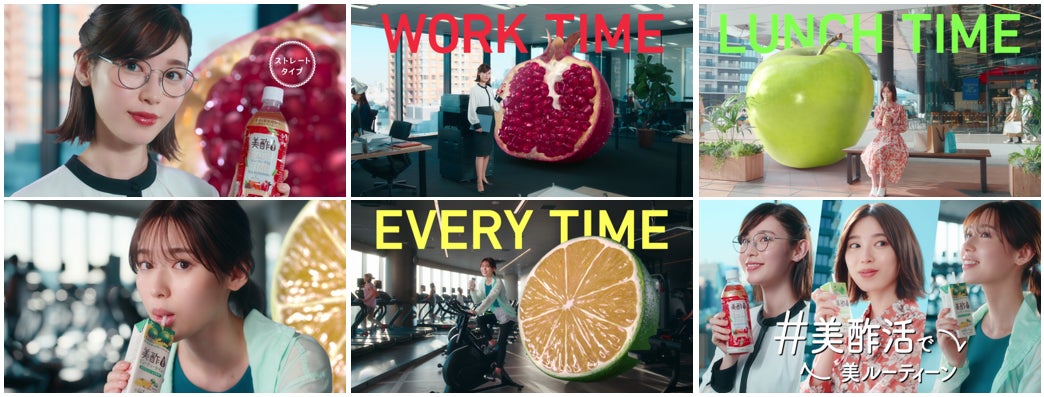 白石さんが、眼鏡をかけたカッチリOL姿の「WORK TIME」、花柄のワンピースを身に纏いリラックスした雰囲気の「LUNCH TIME」、トレーニングウェアを着てスポーツジムでトレーニングをする「EVERY TIME」の3つのシーンでスタイリッシュに美酢 ビューティータイムを飲みます。