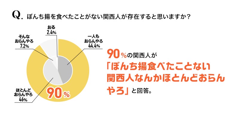 『ぼんち揚を食べたことのない関西人なんて、存在すると思うか』と尋ねたところ、4割を超える方が「一人もおらんやろ」と回答。さらに、「ほとんどおらんやろ(46.0%)」と合わせると、90.4%がぼんち揚を食べたことのない関西人が存在すると思わない(おらんやろ)と回答しました。
