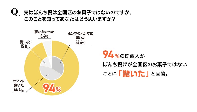 また、『実はぼんち揚が全国区のお菓子ではないことを知りどう思うか』を尋ねたところ、「ホンマのホンマに驚いた」は34.4%に。「ホンマに驚いた(44.4%)」、「驚いた(15.8%)」と合わせると、94.6%が「驚いた」と回答しました。