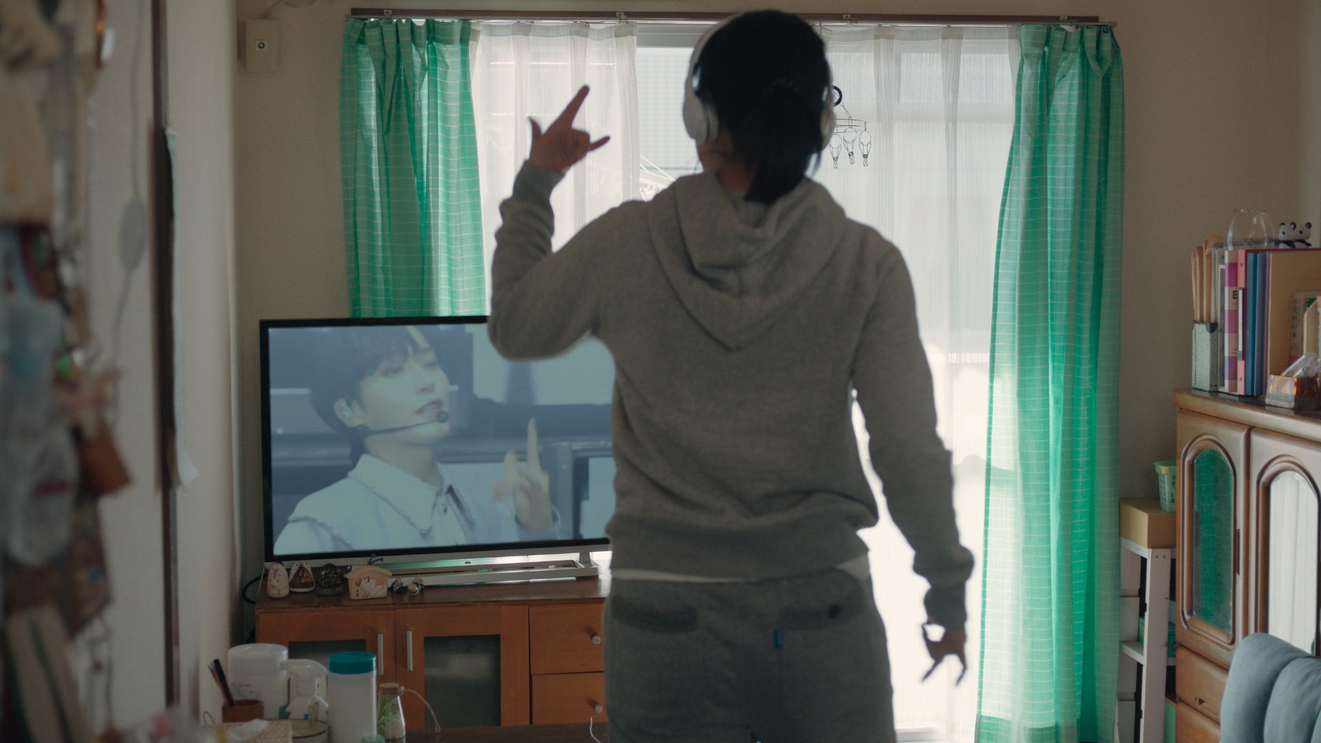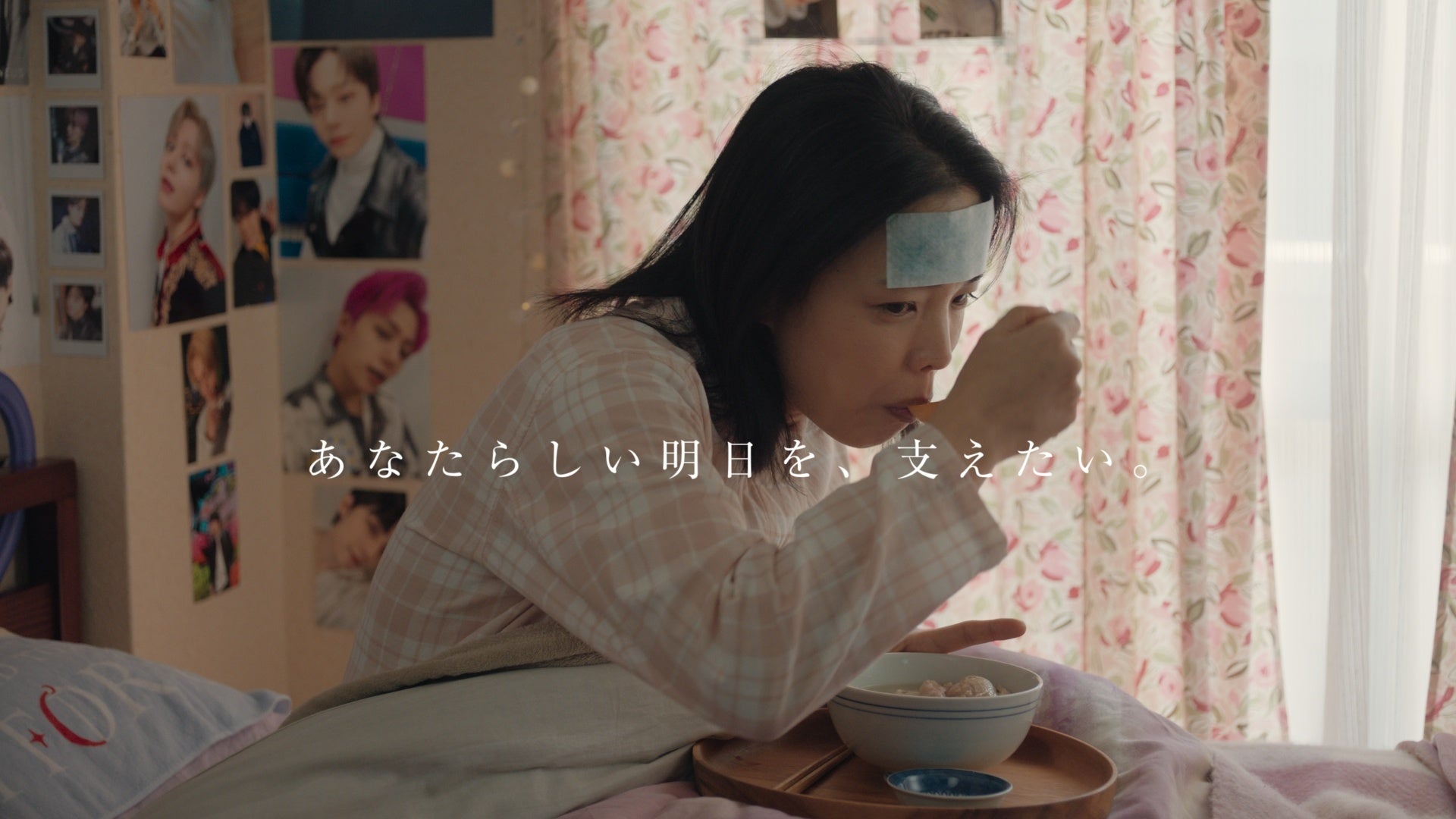 仕事のお昼休憩中、「恋をした。30歳年下の人に」という印象的なセリフとともに、テレビにくぎ付けになる一人の女性。視線の先には男性アイドルグループ「ONEUS」が歌って踊る姿。一瞬で魅力にハマり、美容室では同じく「ONEUS」を推している人と友達になったり、少し殺風景だった部屋は“推し”グッズで埋め尽くされたりと、どんどん世界が広がっていく。韓国語を習い始めてからは、韓国からのお客さんとの会話も楽しめるように。母の様子を見て、最初はあきれ顔を見せていた娘も「なんかもう羨ましくなってきた」と、母の推し活を応援。その後、コンサートの日程が近づいてきたところで、無情にも体調を崩してしまい、コンサートには行けないことになってしまう。「もうおしまいだ」と弱音を吐く母に対し、娘は「何言ってんの!お母さんの推し活まだ始まったばっかじゃん」と言い、母にサムゲタンスープを作り、元気づける。最後はスープを食べながら、吹っ切れた表情を見せてCMは終了。