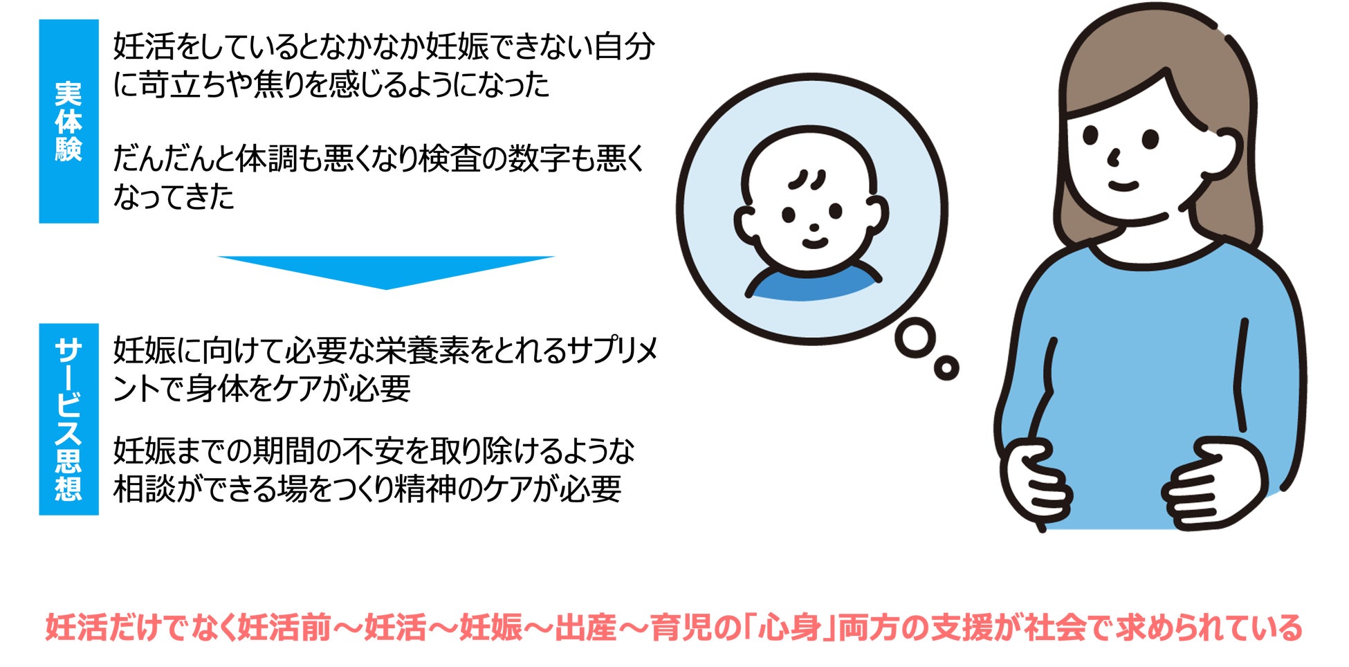 私たちは、妊活、妊娠、産後の期間にわたって、サプリメント提供や専門家によるカウンセリング、対象期間の必要備品のサブスクなどの付帯サービスを提供することを主な事業内容としています。コアとなるサプリメントの提供や専門家によるカウンセリングは関係者による実体験から着想を得ています。