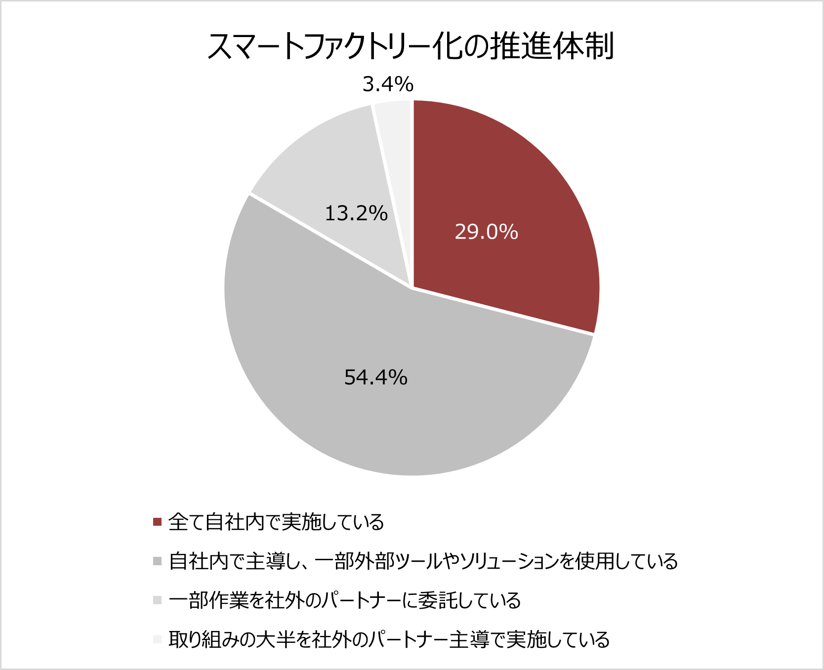 ・スマートファクトリー化の推進を「すべて自社内で実施している」という回答は3割未満にとどまる。スマートファクトリー化を自社のみで推進することの難しさがあらためて分かる結果に。
