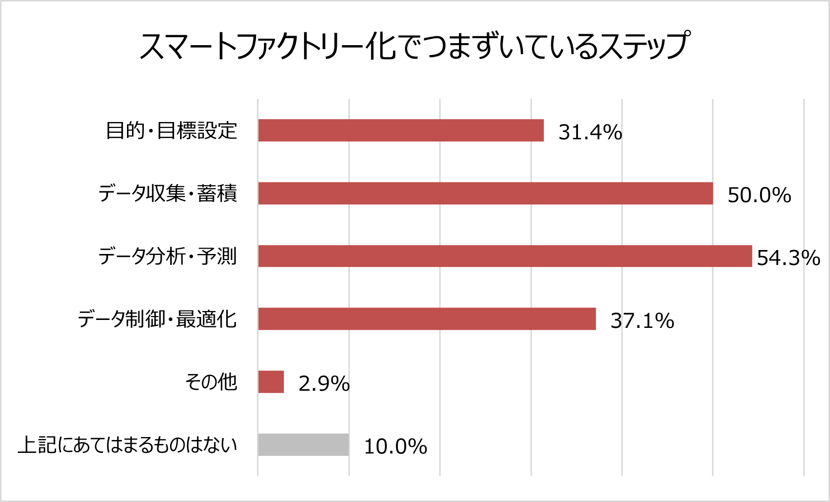一方で、成果を感じていない70名は、主に「データ分析・予測」「データ収集・蓄積」でつまずいていることが分かりました。スマートファクトリー化を進めるにはこのステップをどのように超えるかがポイントになると考えられます。