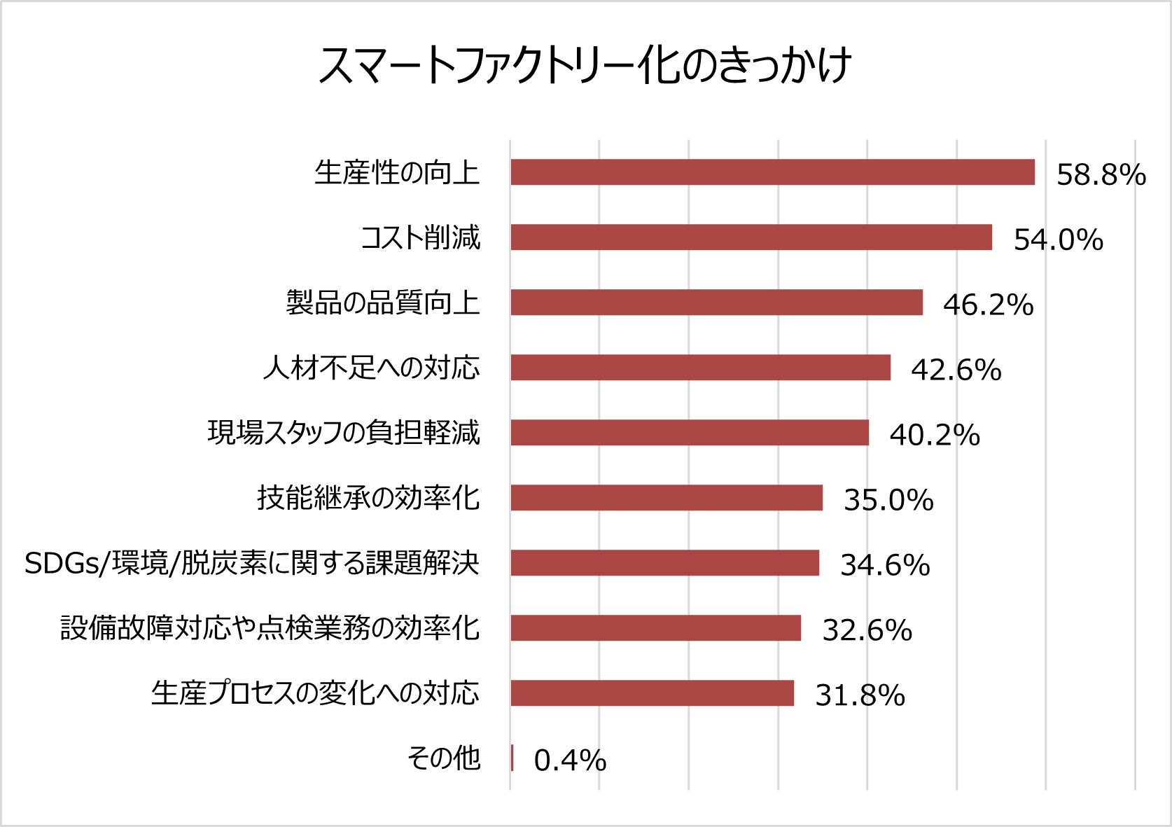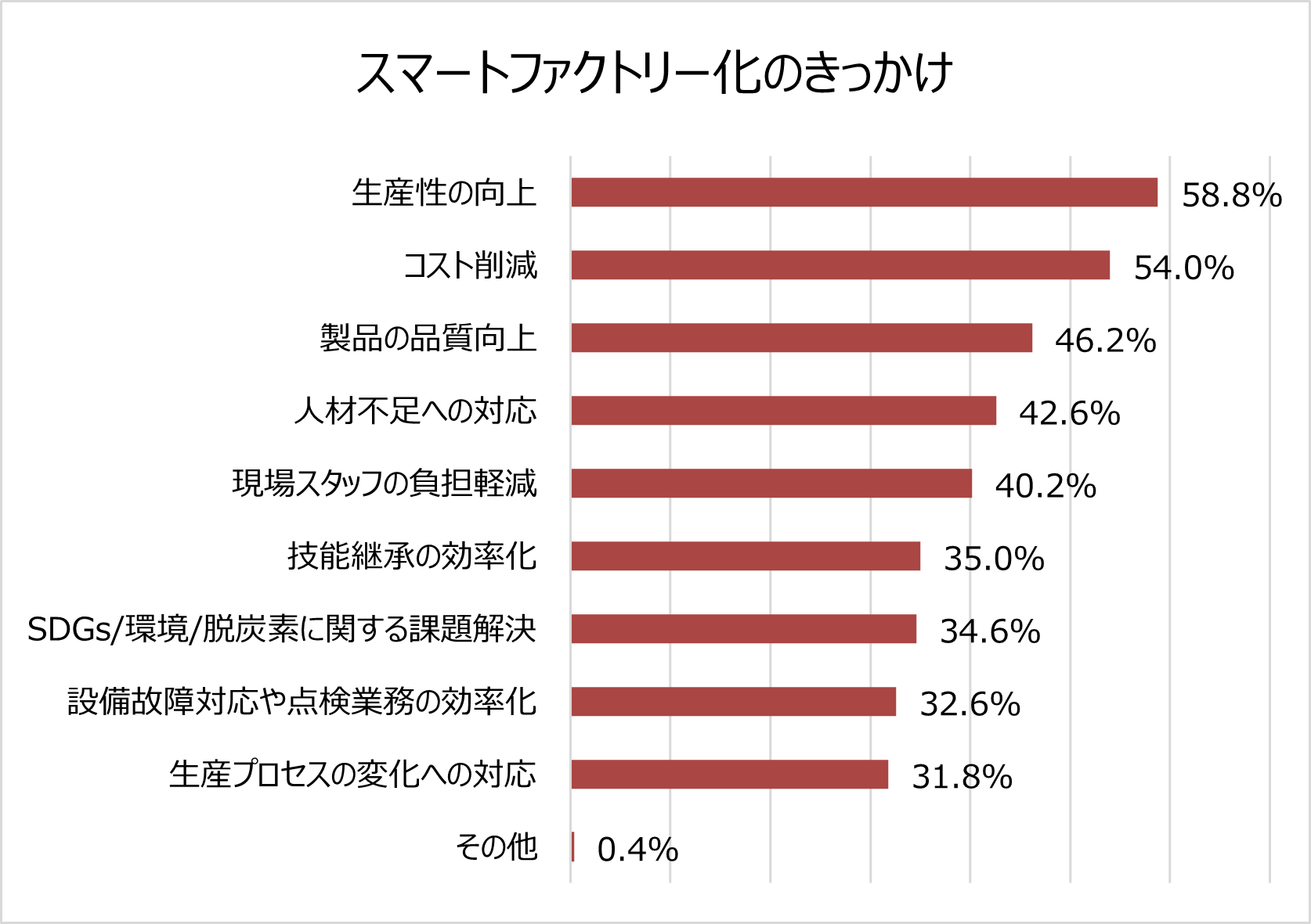 実際に自社のスマートファクトリー化に携わる500名に対し、スマートファクトリー化のきっかけをお聞きすると、設備稼働率改善・生産プロセス短縮・生産計画の精度向上などの「生産性の向上」が58.8%と最も多く、次いで、「コスト削減」が54.0%と続きました。